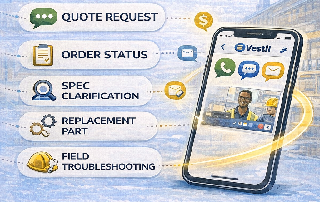 Common uses include quote requests, order status updates, specification clarifications, replacement parts, and field troubleshooting. It can also help customers who want to know where to buy a Vestil product or which contact is best for a specific issue.
