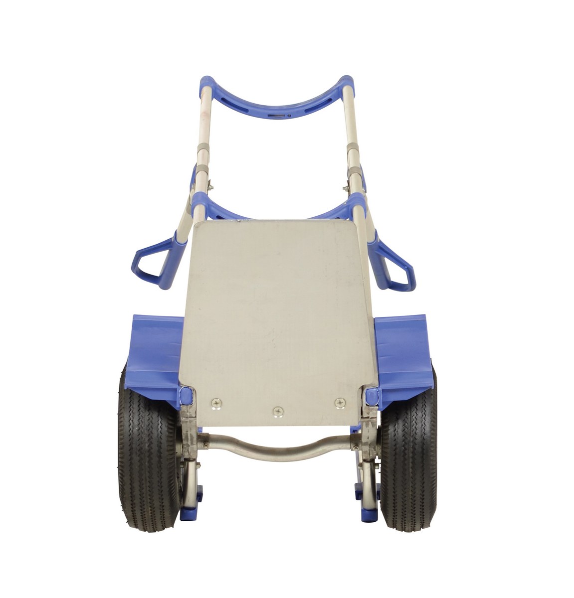 Heavy-duty construction, yet lightweight aluminum design, provides superior control. This unit has knuckle guard handles, fold up nose plate, and curved back plate for transporting cylindrical objects. Transporting down stairs or steep hills is no problem with this unit. 10" x 3-1/2" pneumatic wheels are standard. Ships fully Assembled.