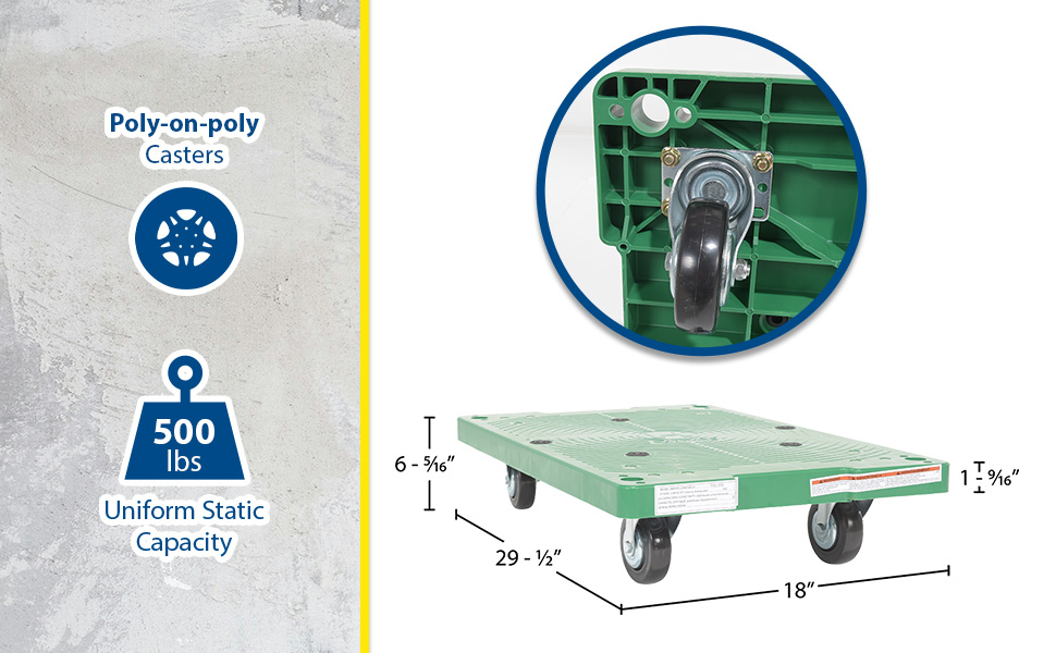 POS-1830 POS-1830Polyethylene Dolly 30 In. x 18 In. x 6-5/16 In. 500 Lb. Capacity GreenUniform Static Capacity (lb.): 500