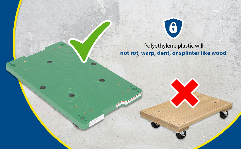 • Plastic will not rot, warp, dent, or splinter like wood dollies
