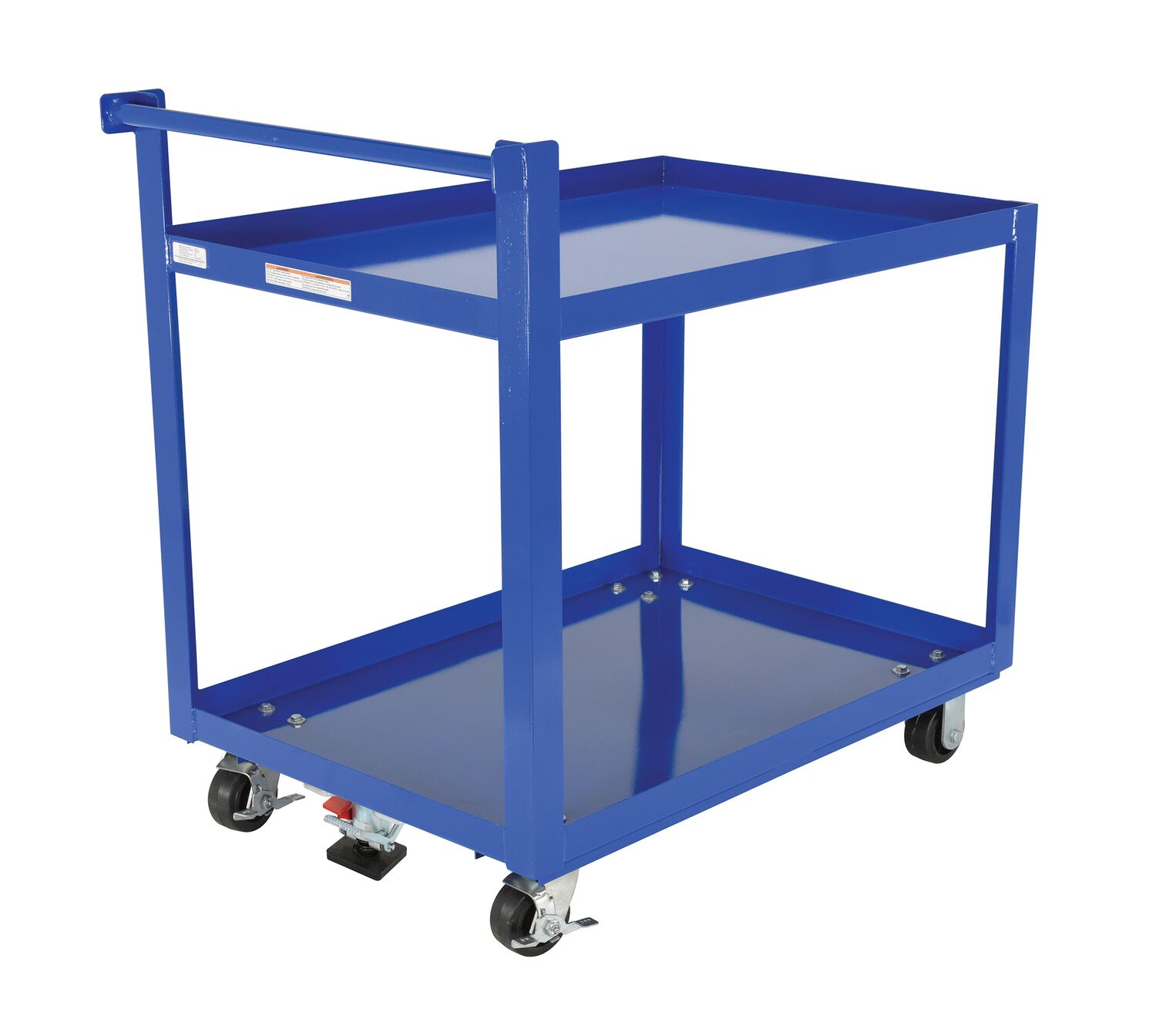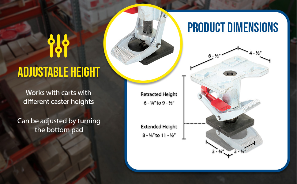 This one of a kind floor lock includes an adjustable height foot pad that will work on carts with different caster heights. The adjustable height feature provides uniform locking and safety unlocking force for better ergonomic operation. This feature also keeps the floor lock working properly as spring and pads wear over time. Height is adjustable by turning the bottom pad. The bottom pad includes suction-cups for extra grip.