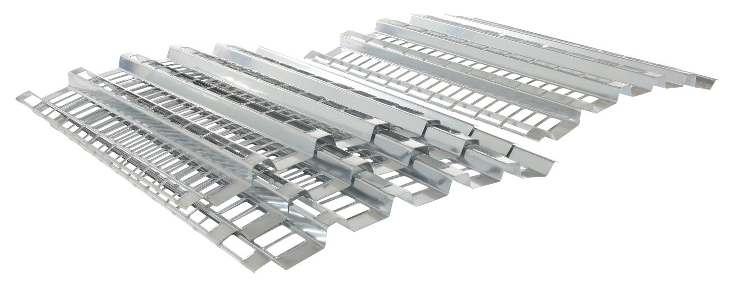 Ideal for storing furniture, carpet, record files or products that require a uniform support. Fire protection friendly with 50% open design. Designed for pallet rack beam with 42" deep racking. The bright galvanized finish makes the 22 gauge steel rack appear more industrial. Fits 1-1/2." beam offset. The top hats are 3-1/2" wide with top slotted holes 1-1/4" x 2-1/2" and the valleys are 2-1/2" wide with slotted holes 1" x 3". Custom sizes available, contact factory.