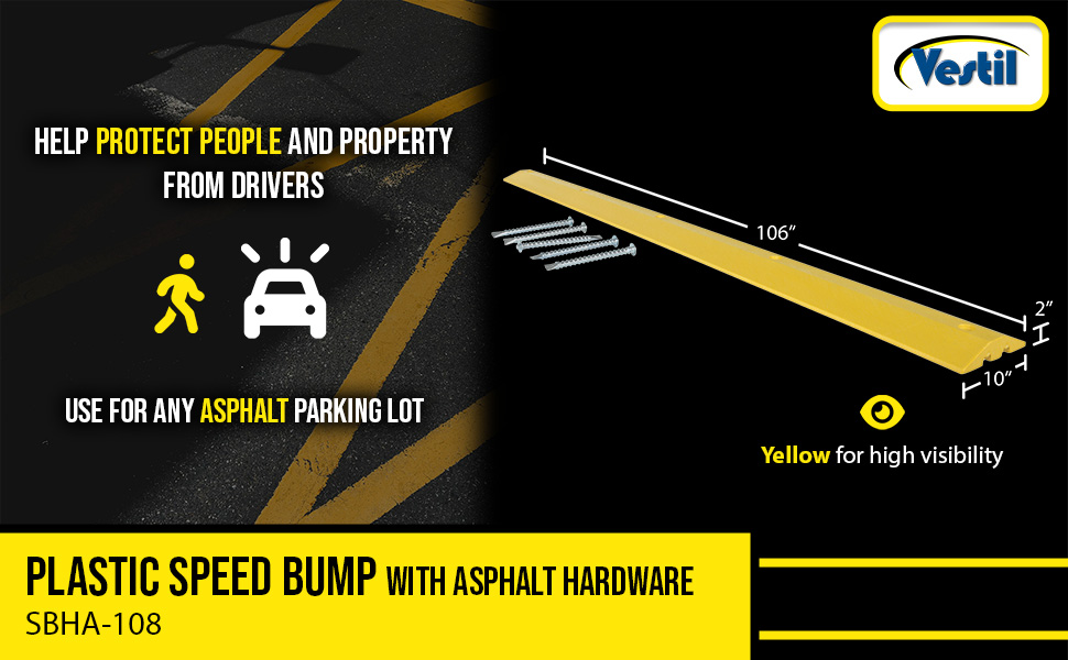 | Plastic Speed Bump Heavy Duty Asphalt Hardware 106 In. x 10 In. x 2 In. Yellow | Compression Strength Per Square Inch (lb.): 3200 Number of Mounting Holes: 5 | 45 |