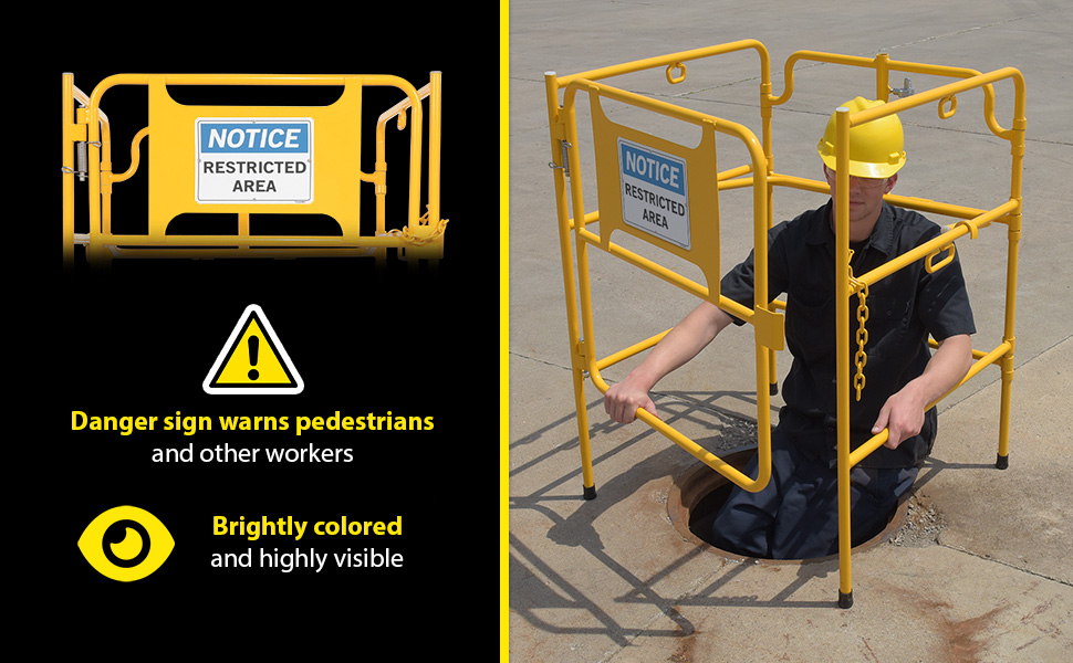 MHGR-32-SI-N-02 MHGR-32-SI-N-02Steel Manhole Guard Rail with Aluminum Sign 31 In. x 30 In. Notice Restricted Area Sign Message YellowUsable Width/Length (in.): 31 x 30
