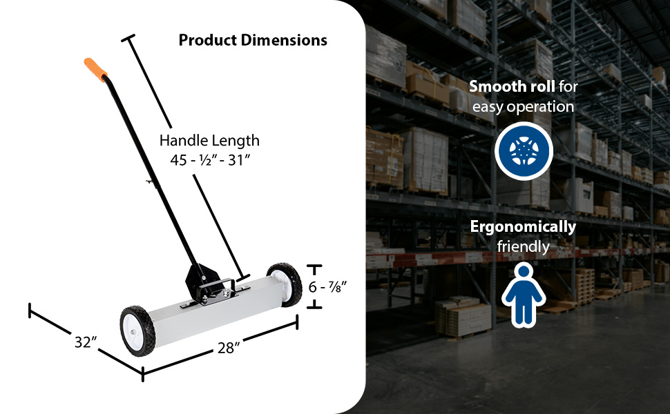 Magnetic Sweepers are ideal for manufacturing facilities and construction sites. The sweeper is ergonomically friendly with an efficient handle controlled release. The design and capacity can accommodate large and small materials. While the standard handle allows for comfortable upright position during use, the wheels allow smooth rolling for quick and easy collection of objects.