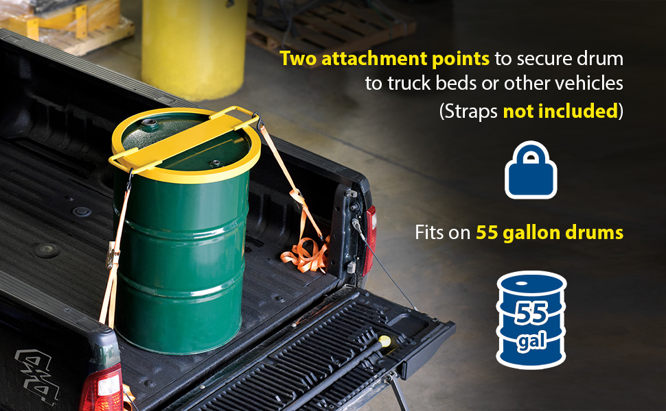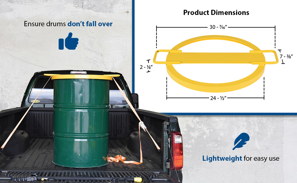 This drum tie down is a great asset for both work and home. The tie-down has a 24" diameter creating a snug fit over the top of a 55 gallon drum. Once in place, the two attachment points can be utilized to help secure the drum to the bed of a truck or other transporting vehicles with assistance of cables or straps. Cables and straps not included. The strong steel construction withstands the wear and tear of daily use, while the highly visible yellow finish provides a smooth surface for safe handling. When not in use the unit is storable due to its low profile, compact design. Baked-in powder-coated toughness.
