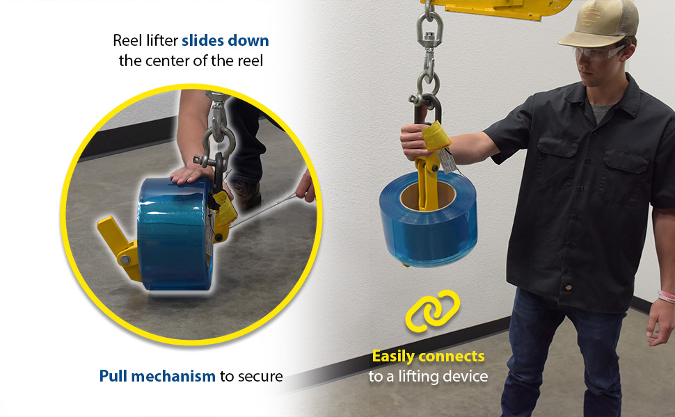 Maneuvering reels has always been heavy and awkward. But, now, the reel lifter makes it easy. The reel lifter simply slides down the center of the reel. When pulled up, the bottom feet act as a brace against the inside of the reel. Easily connects to a lifting device and has large capacity to handle loads that are both heavy and light. Lightweight for easy handling. Compact design. Accessible top lifting ring.