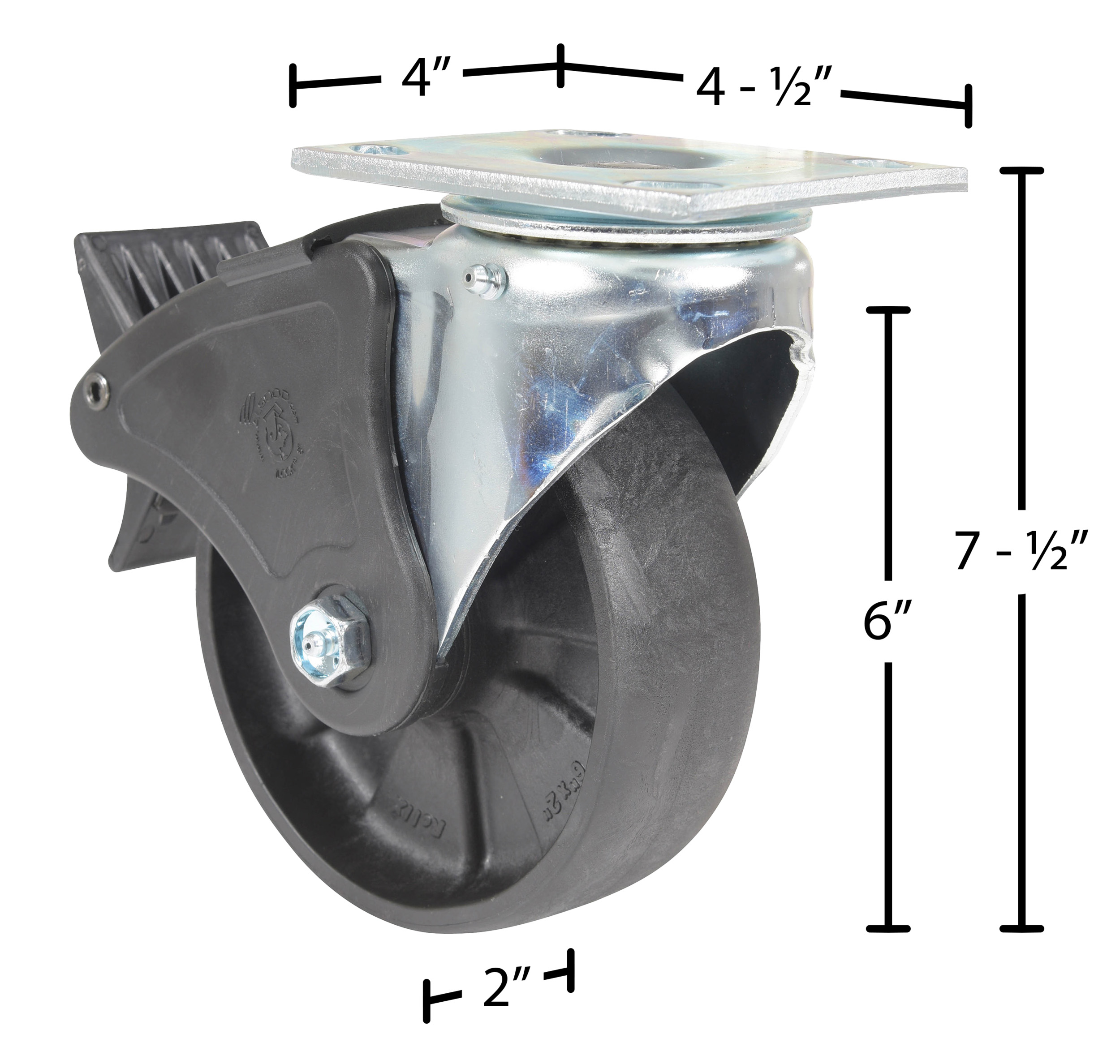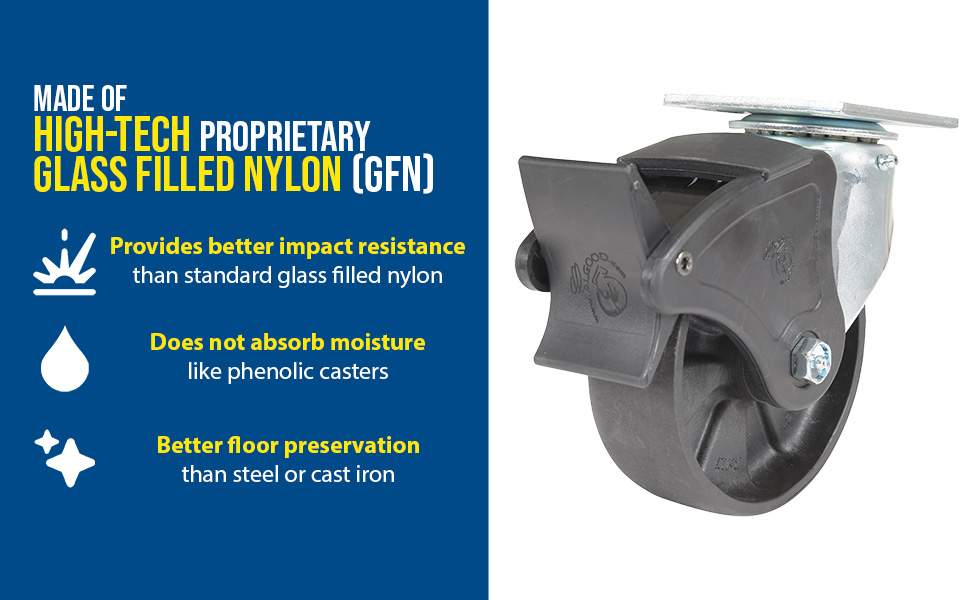 Made of high-tech proprietary glass filled nylon (RX). Provides better impact resistance than standard glass filled nylon. Does not absorb moisture like phenolic, and offers better floor preservation than steel or cast iron. Resists most chemicals, solvents, gases, acids and steam cleaning. Top plate measures 4 x 4-1/2". Black tread color. 85 (+/-5) Shore D. Wheel core material is glass filled nylon.