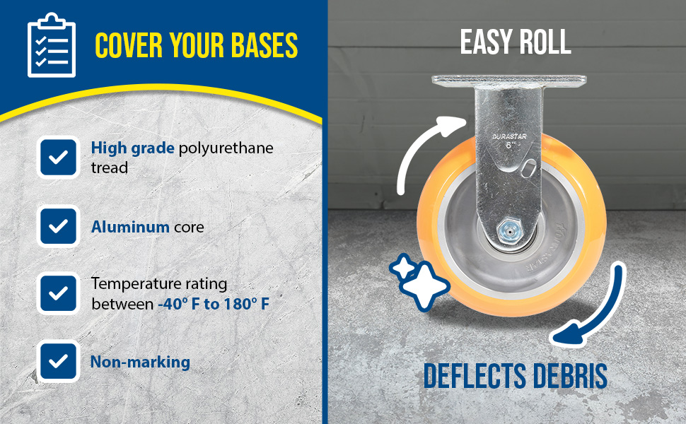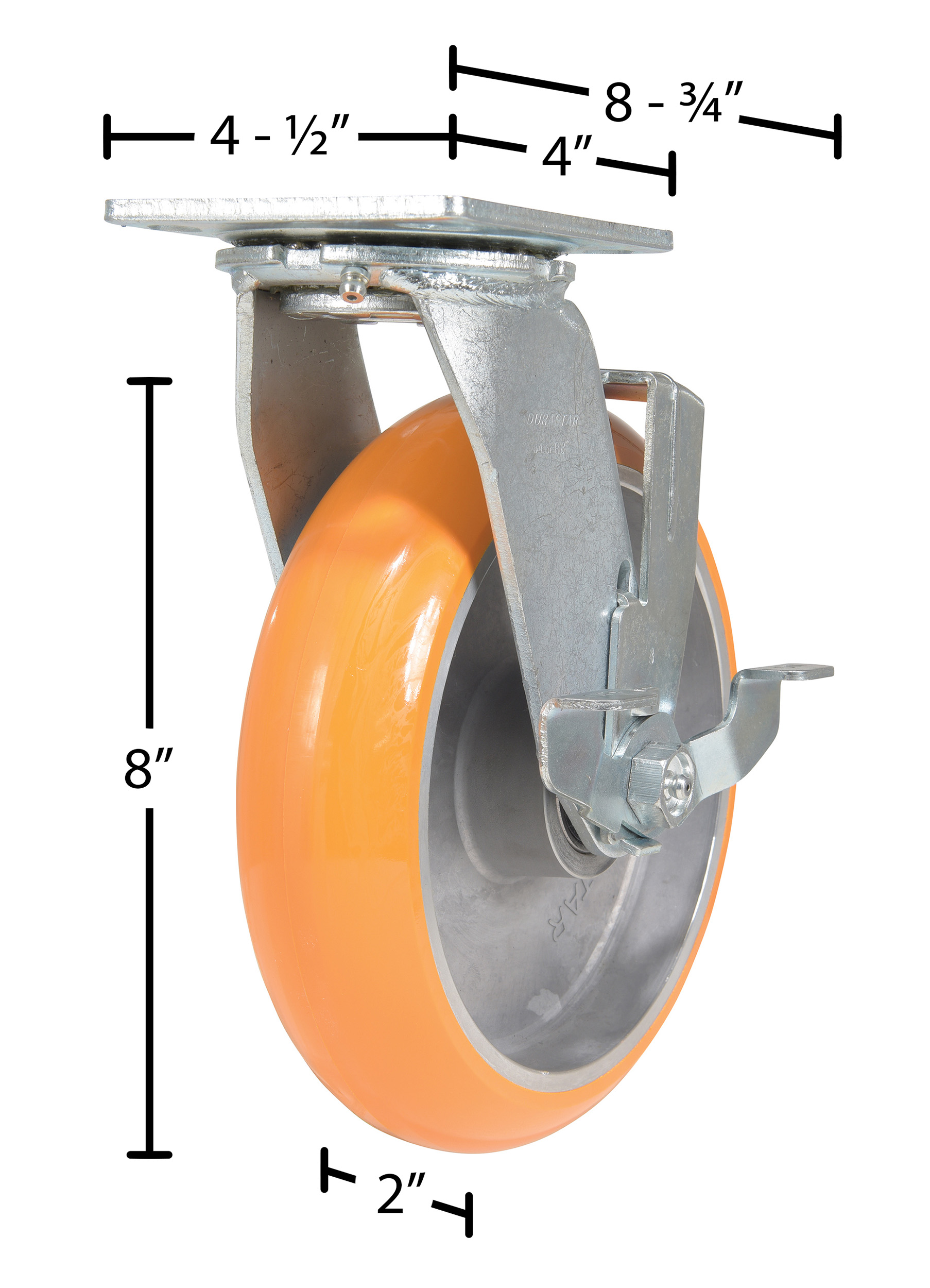 Constructed of proprietary, high-grade elastic polyurethane and coupled with 6203 premium precision ball bearings for added strength and durability. The upgraded tread provides a longer life, reduces the force required for movement, rejects debris, and offers exceptional floor preservation. Orange tread color. 85 shore a. Wheel core is constructed of high-grade, light-weight, water resistant aluminum.
