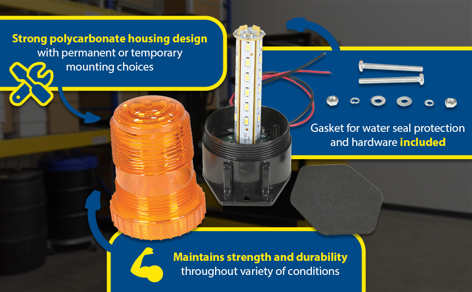 The fork truck safety and warning light helps keep equipment and personnel safe in industrial surroundings. The amber color is highly visible in both well and poorly lit environments, while the automatic strobe function of three LED's gives an extra sense of caution. A strong polycarbonate housing design with a permanent or temporary mounting choice maintains strength and durability throughout a variety of conditions. Gasket for water seal protection and hardware are included.