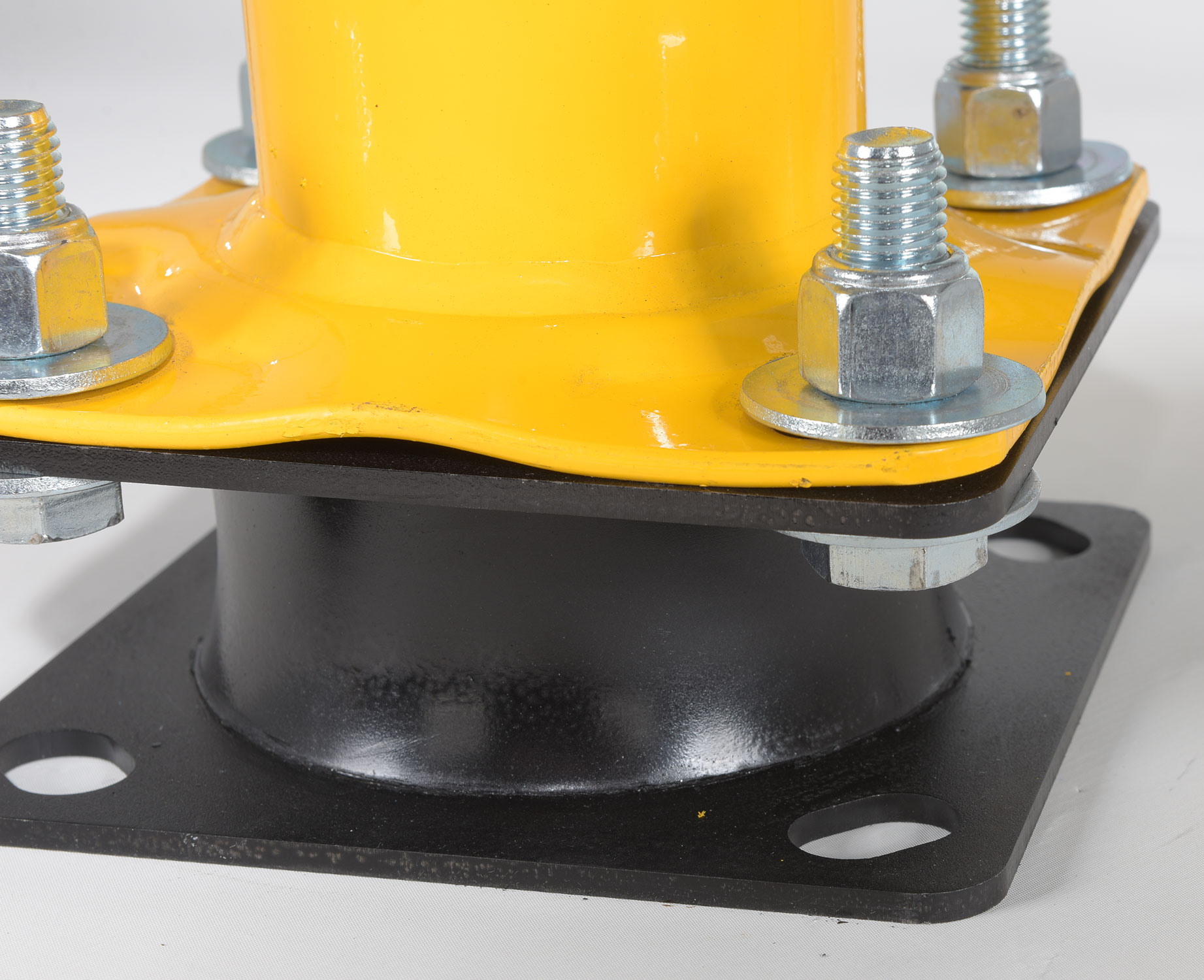 Bumping into or making contact with a bollard can sometimes cause damage. But, now, with the energy absorbing bollard plate, damage will be minimized. The bollard plate turns an original stand-in place bollard into one that sways upon impact. A rubber core between the two steel mounting plates allow for movement when contacted by an outside force. Pre-drilled mounting holes make for simple installation to a variety of surfaces and existing bollards. Painted finish for long lasting toughness.