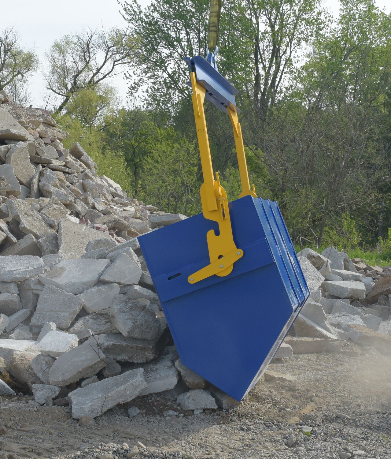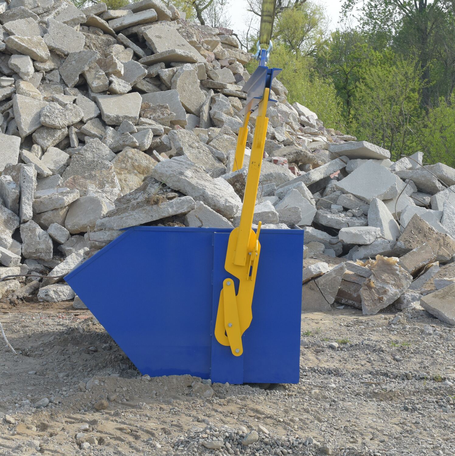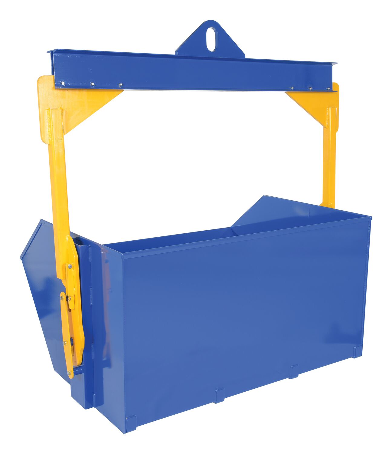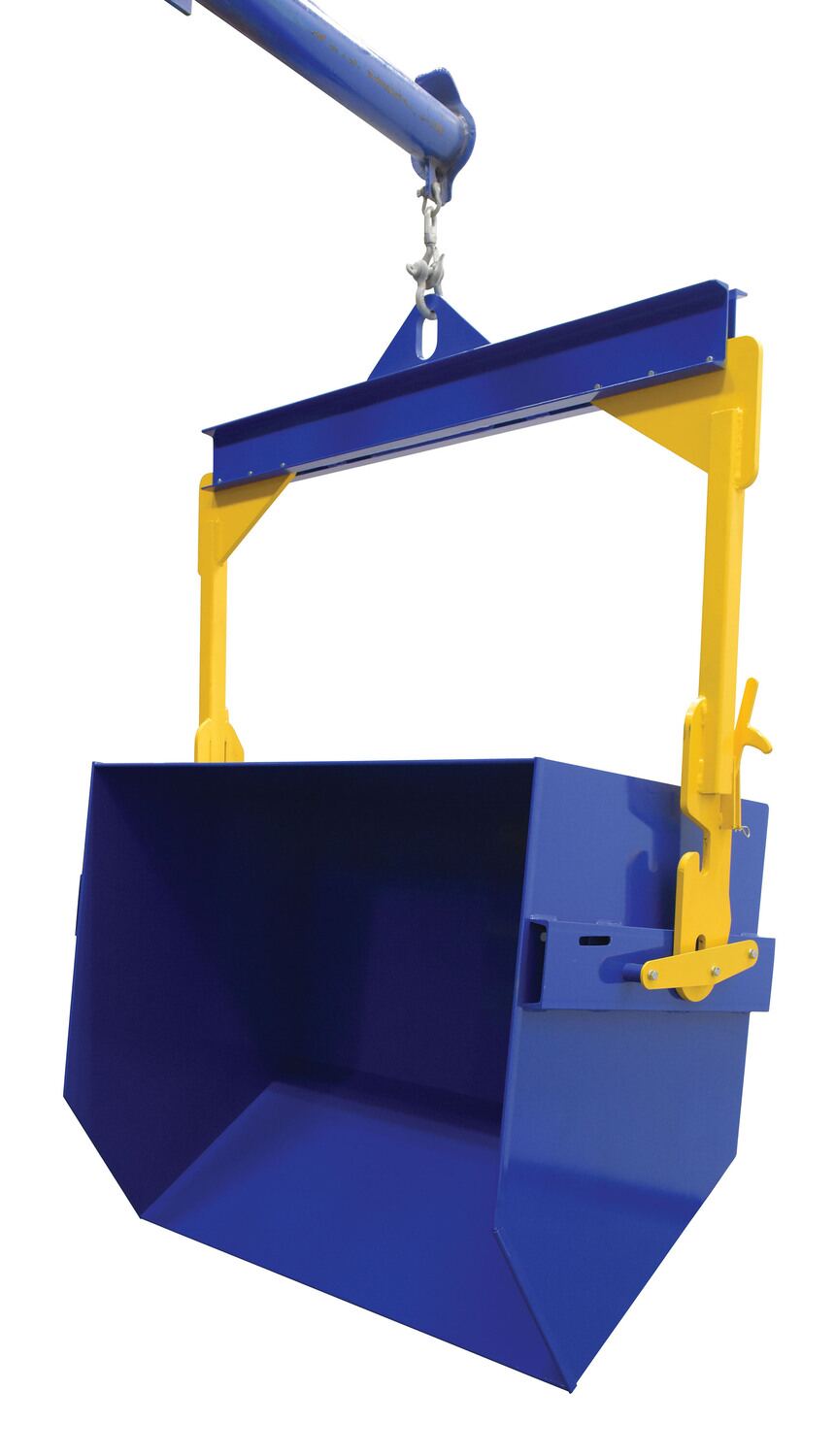 A self-dumping bin creates an efficient way of maneuvering heavy loads between construction areas. A deep design with high side walls make it simple for items both large and small to be safely transferred. The overhead lifting bar with a pre-cut center opening enables secure lifting by the preferred heavy lifting equipment. Lever release design ensures safety as well as effective unloading of contents.