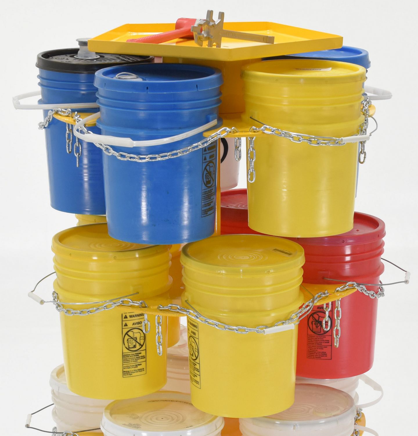 A Pail carousel rack is a quick way to transfer loaded and unloaded pails. Each bay is a perfect fit for a 5 gallon pail, while an included safety chain gives an extra level of security. The carousel design enables circular movement of each tier, allowing the user to maintain their position instead of moving to each individual pail bay. The rack is constructed of 1/4" thick powder coated steel.