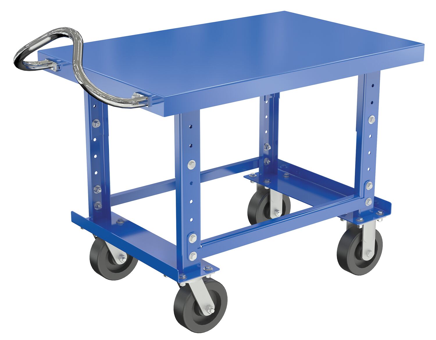 An adjustable height cart provides a broad selection of height variations. Adjustability of the cart allows the working height to be tailored to better fit individual needs. The platform has a range that spans from 33"-41" in height. With a tall handle bar the user can maintain safe control and stability throughout movement. Two swivel and two rigid casters give the cart its dynamic mobility.