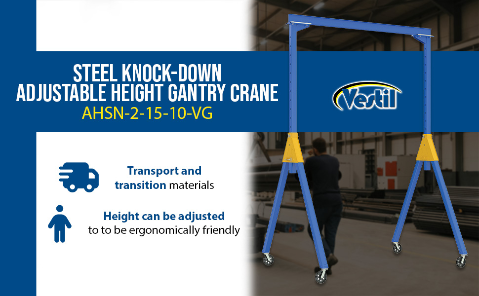 | Steel Knock-Down Adjustable Height Gantry Crane with V-Groove Ductile Steel Casters 15 Ft. Wide x 9 Ft. Max Usable Height 6,000 Lb. Capacity Blue | Uniform Capacity (lb.): 6,000 Adjustable Clearance Range (in.): 73 to 109 | 701 |
