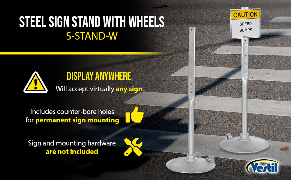 S-STAND-W S-STAND-WSteel Sign Stand with Wheels 16.75 x 17.38 x 48 SilverCounter Bore Holes (each): 3