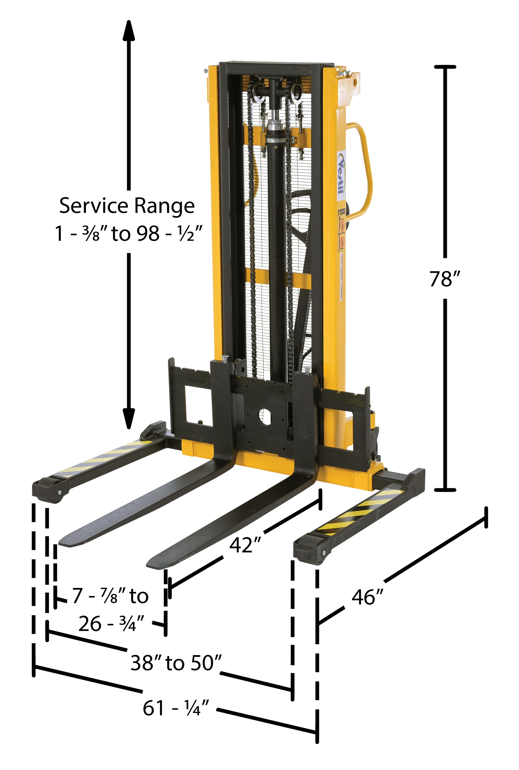 | Steel Manual Stacker Adjustable Forks/Legs 2,000 Lb. Capacity Black / Yellow | Uniform Capacity (lb.): 2,000 Service Range (in.): 2-1/8 to 63 | 860 |