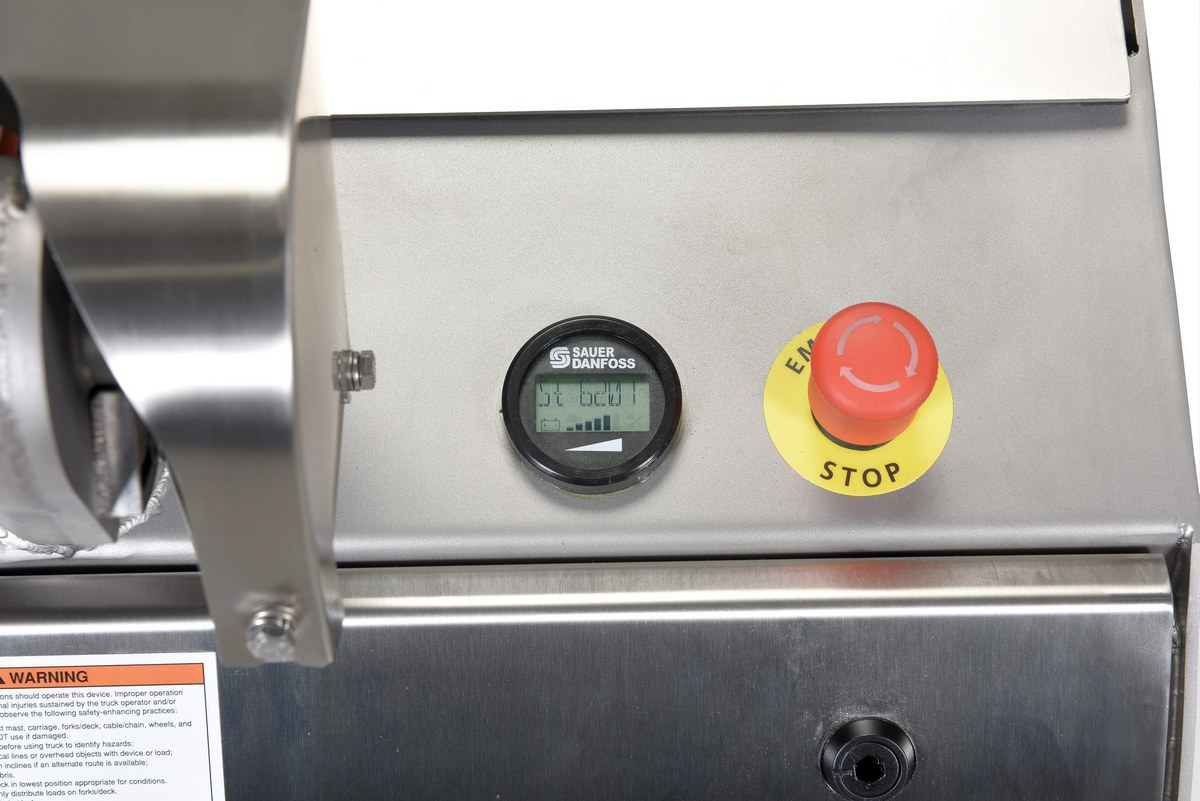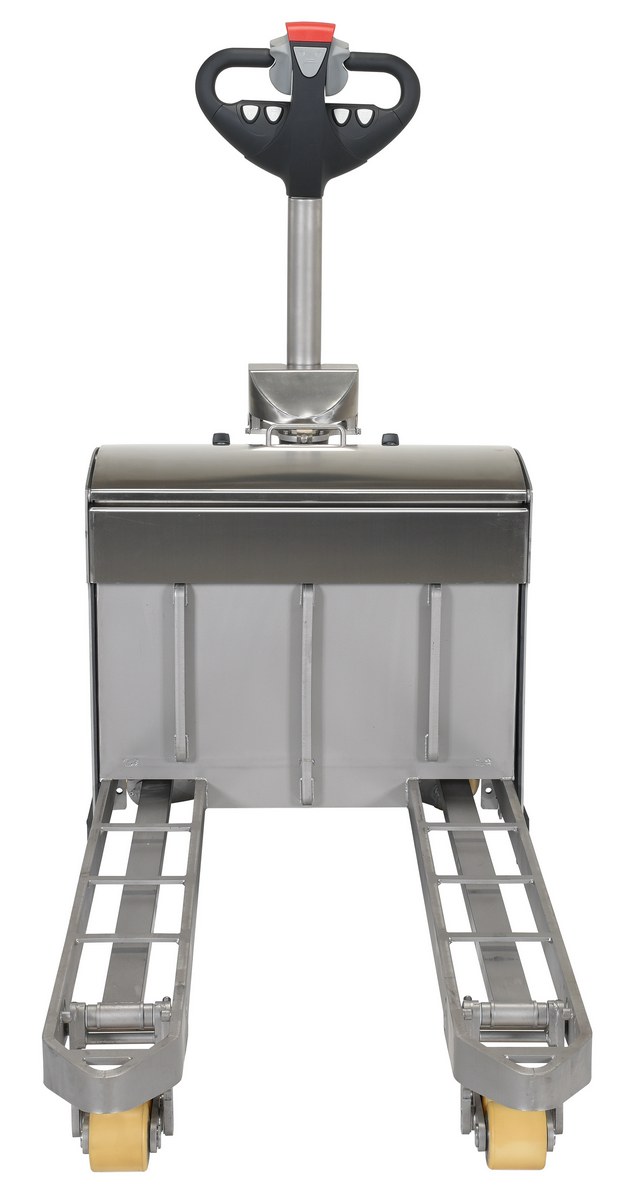 The 304L Stainless Steel Electric Pallet Truck is an ideal supplement to food service and other sterile settings. The 304L stainless steel construction including hydraulic cylinders as well as the piston provides not only a strong structure for transferring heavy loads between work areas, but is also easily washable. An enclosed shelter for electronic components that is simple to access for general upkeep, while the humidity resistant electronics are great for working in difficult conditions. The adjustable height handle with built in horn helps maintain an ergonomic posture of the user during use. The emergency stop is perfectly located near the driving position of the unit for a rapid shut-down in the case of a crisis. During use the unit maneuvers efficiently on its waterproof roll wheels. Unit comes standard in 304 Stainless Steel (316 Stainless Steel is an option, contact factory for pricing). Battery is 24V.