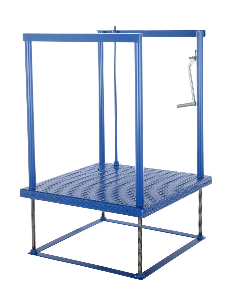 The Posi-Crank incorporates the use of acme threaded rods and a series of gears for simple yet effective height adjustment. A heavy duty chain is used in lieu of a belt to ensure a positive working height without risk of slippage. The crank handle may be removed and placed on the handle holder for maximizing the operating space. The deck is constructed of 1/8" steel tread plate for strength and the best traction. Maximum capacity is 500 pounds. Vertical travel range is 3" lowered to 19" raised. The Posi-Crank is constructed of steel to provide for years of service. The unit is painted blue, while the ergonomic anti-fatigue matting is also blue.
