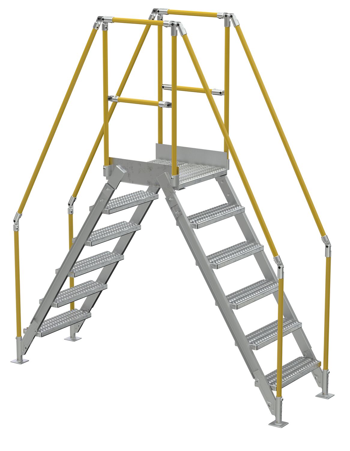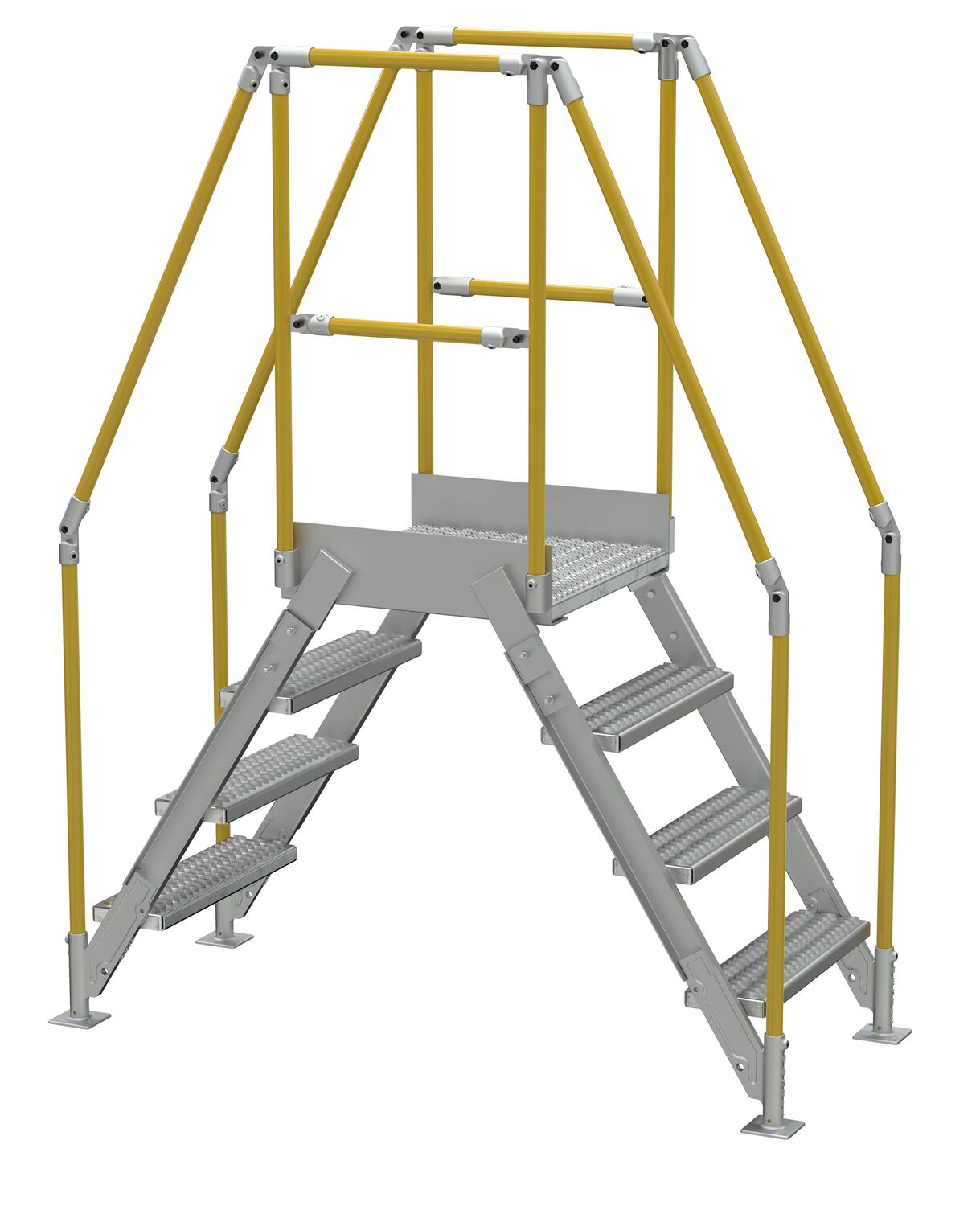 In industrial settings, every inch of floor space matters. With the installation of a cross over ladder, all floor space is able to be utilized fully. An aluminum construction and simple mounting, the ladder can be placed in a permanent location to best fit the floor layout. Serrated steps give the user sure footing going up and down the ladder, while the handrails give added security. Mid and top rails give balance and safety support to users while on the upper platform. Hardware is included. Handrail is powder coated yellow for increased visibility.