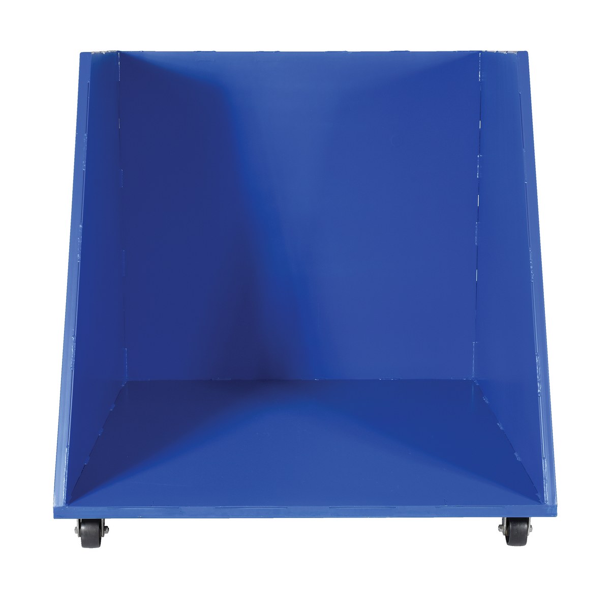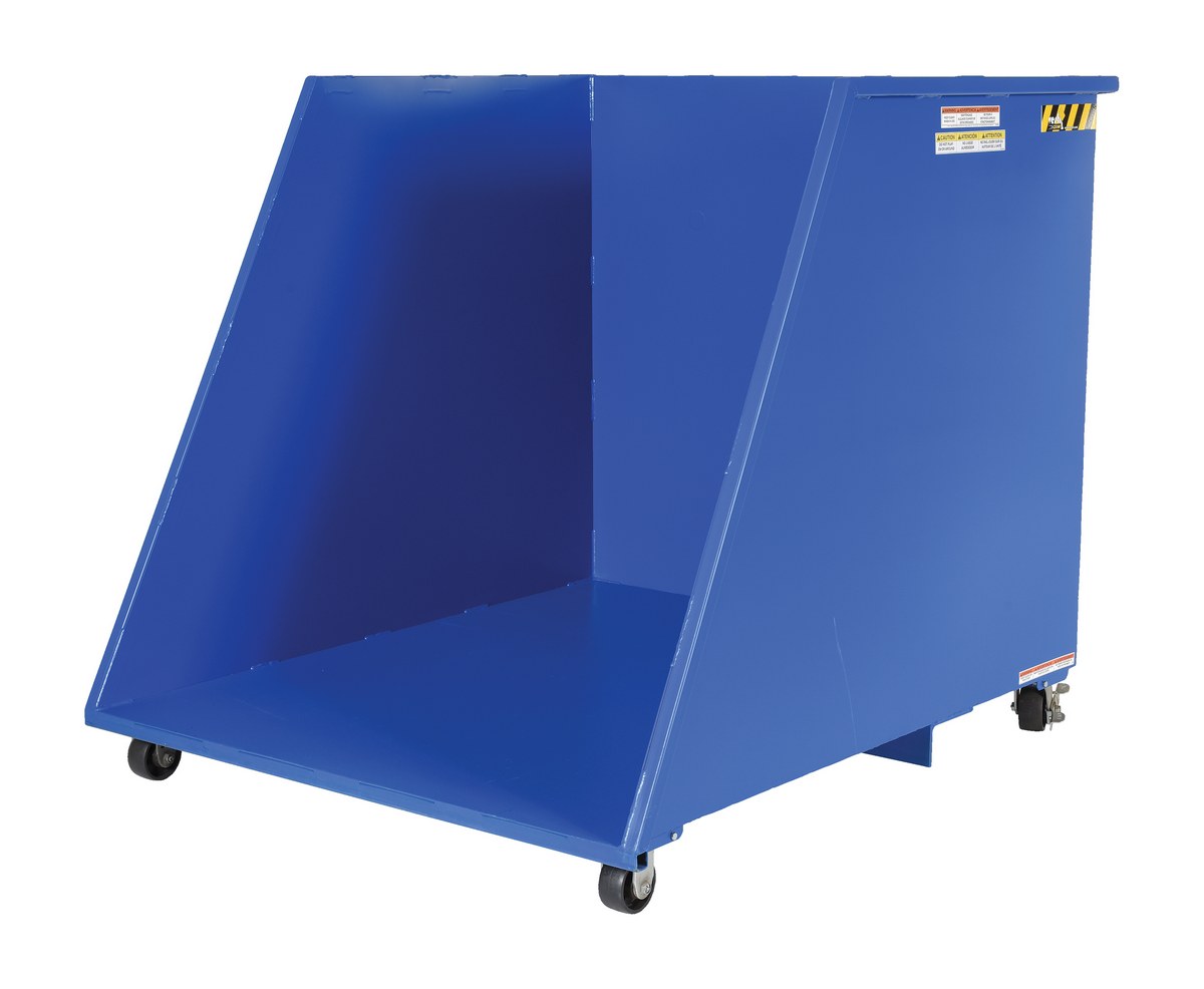 Reduce bending and lifting motions while loading items into a hopper. This hopper will allow for convenient and orderly loading at ground level with its open front design. Flat items can be loaded so more can be put into the hopper. Rolling smoothly on 4" x 2" glass filled nylon casters, the hopper can easily be moved from one location to another. Once the hopper is full or the user has finished loading, the hopper can be easily dumped with the use of a fork truck. Must be attached to a fork truck when dumping.