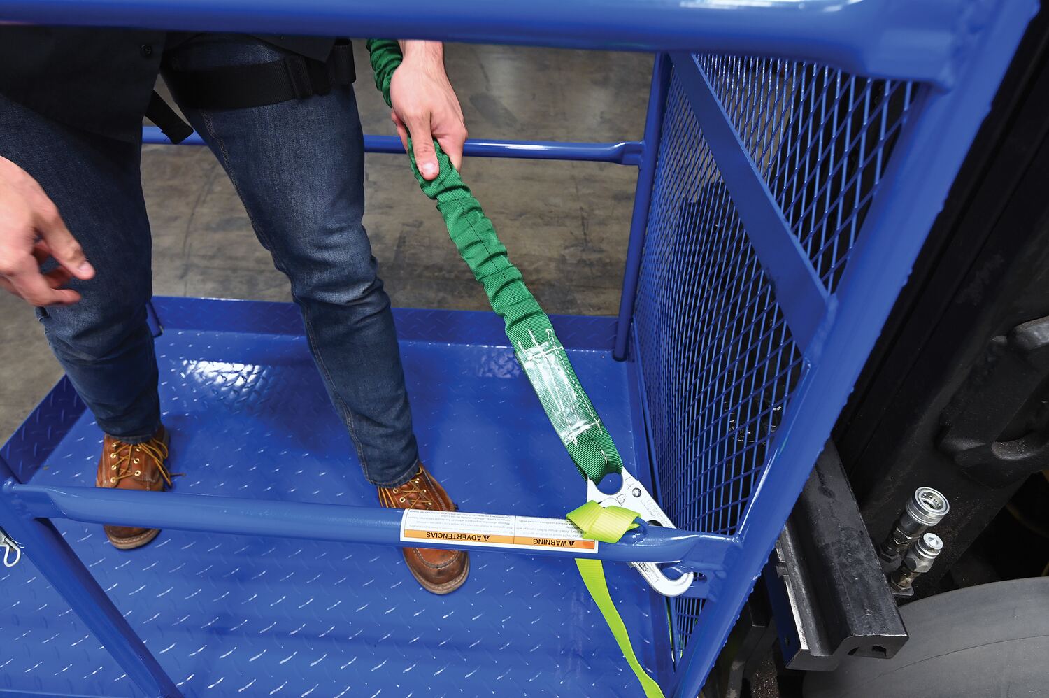 Each platform is built with key safety features including tine locks and a safety strap that secures the unit to the forktruck carriage. Select models include a spring-loaded self-closing door, while a yellow breakaway top section helps reduce risk from overhead contact.  Models with an -84B suffix meet California OSHA requirements with an 84” rear guard. Platforms are designed for use with a safety harness with lanyard (available under options) and include anchor points to hook them too.  Anchor point capacities:
