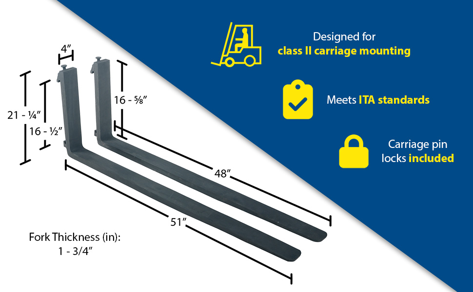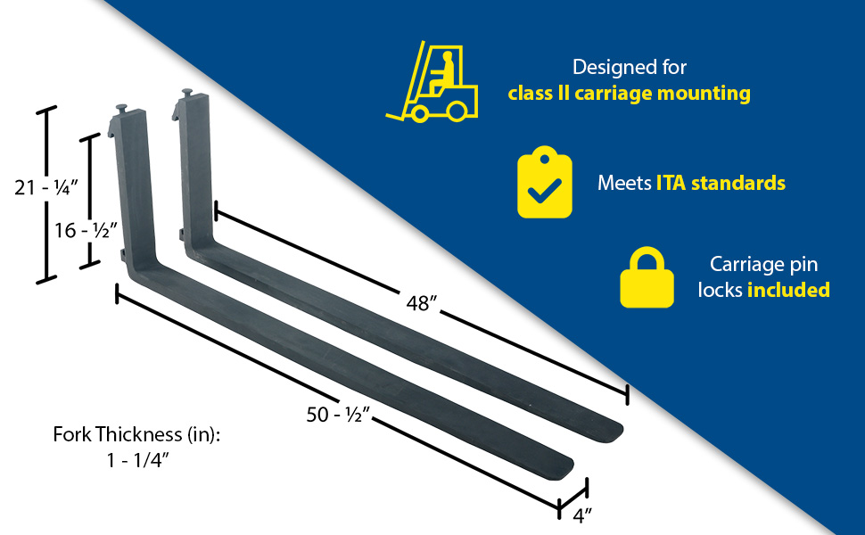 Change your current fork length or buy an extra pair of forks for an emergency with our new Forged Steel Forks. Forks are 4" wide each. Designed for class II carriage mounting. Meets I.T.A. standards.