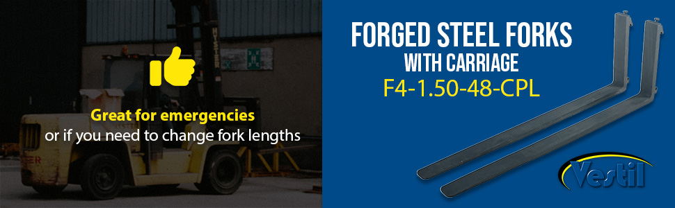 F4-1.50-48-CPL F4-1.50-48-CPLForged Steel Forks with Carriage Pin 48 In. x 1-1/2 In. 4,000 Lb. Capacity BlackUniform Capacity Per Pair (lb.): 4,000