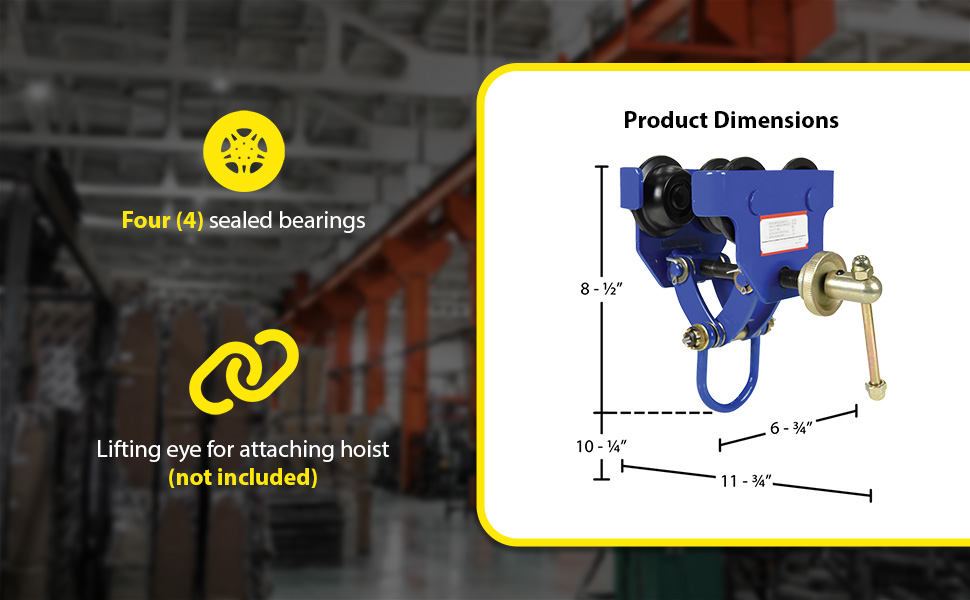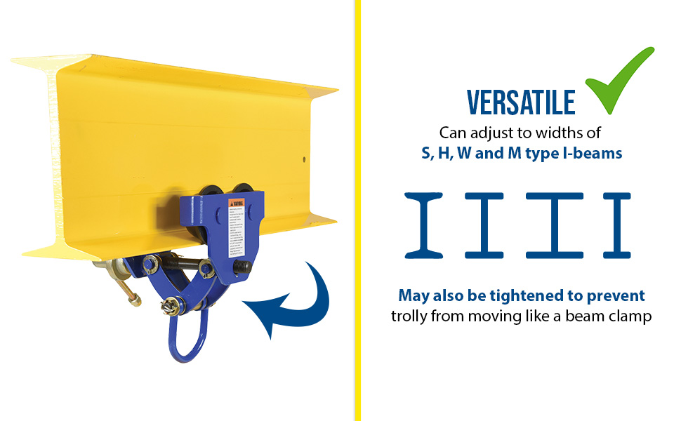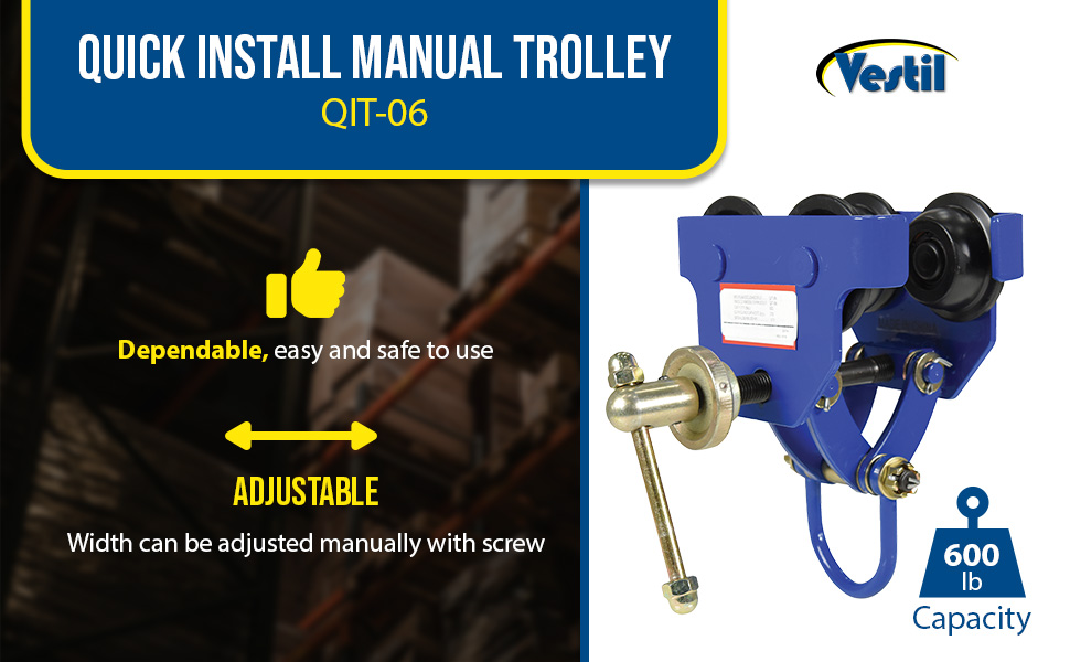 QIT-06These trollies are dependable, easy and safe to use. Designed to easily adjust to the width of virtually any S, H, W and M type I-beam. Width is adjusted with manual screw mechanism. Includes locking ring to prevent trolley width from changing accidentally. Manual screw mechanism may also be tightened to prevent trolley from moving (similar to a Beam Clamp). Each trolley includes four rollers with sealed bearings for long life. A lifting eye is located at the bottom of the trolley for attaching to a hoist (hoist sold separately). Steel construction and painted finish.