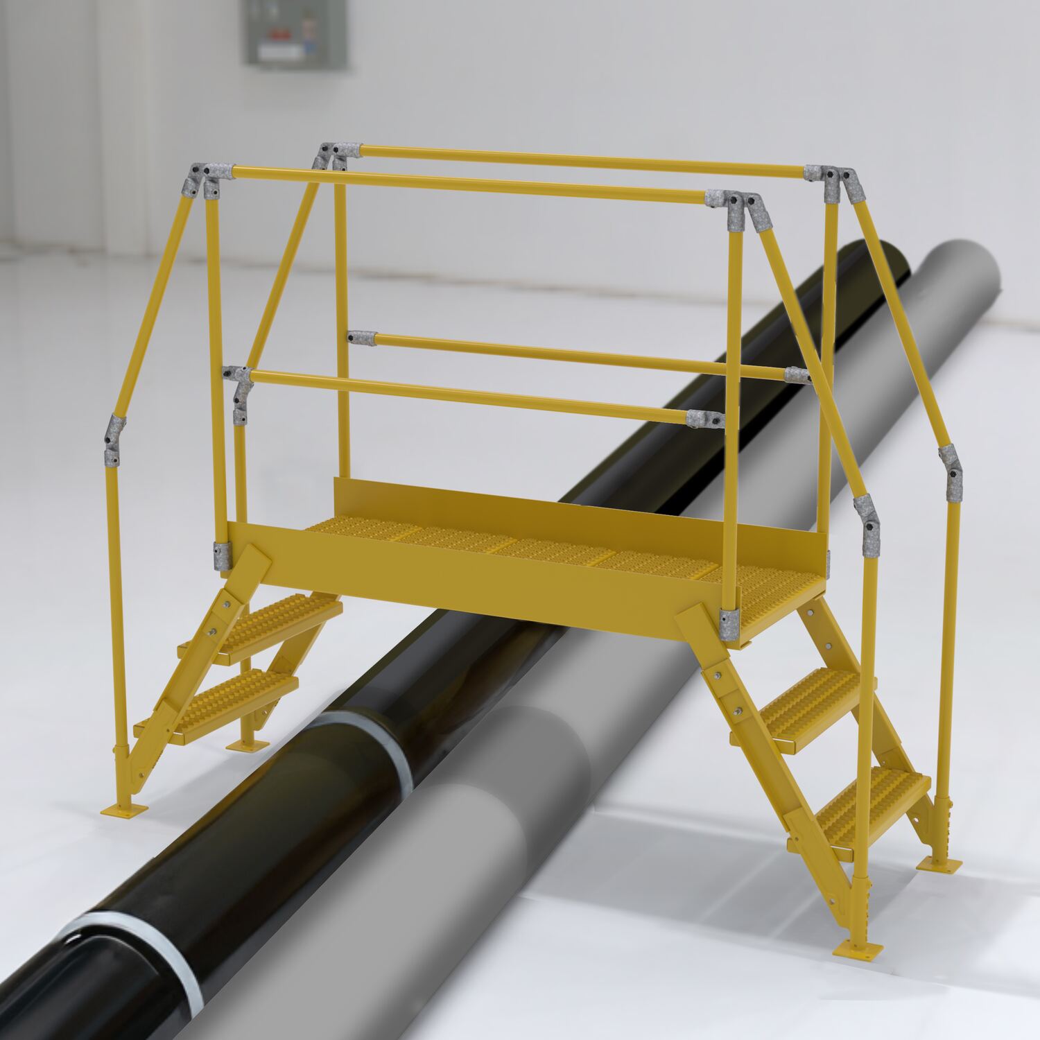 Mount where you need permanent access at crossover points. The upper platform features removable two sided 42-5/8" high handrail with 21" mid-rail and fixed 4" toeboards to prevent objects from rolling off. Serrated steps for extra grip and safety are 23-1/2" wide and 7" deep with a step spacing of 10". The angle of the steps is 58 degrees. The overall ladder width is 29-1/4". Ground legs include floor mounting pads. Units must be anchored to the floor. Units are all welded steel construction but can be knock-down for storage and shipping. Uniform capacity is 500 pounds. Meets ANSI A14.7 and OSHA 29 CFR 1910.24. Baked-in powder coat finish for added toughness.