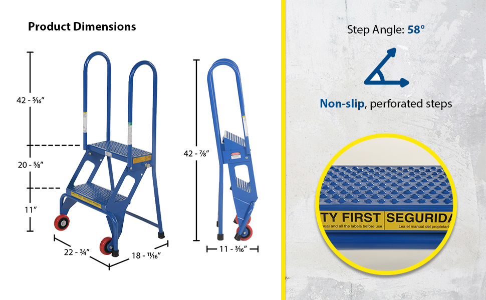 Locking foldable design saves on storage space when ladder is not in use. Ladder folds after unlocking spring-loaded detent pin. Once unit is folded, tilt back on wheels for easy portability. Available in either carbon steel or stainless steel. The steps are perforated to provide a non-slip surface. The ladders have 7" deep steps and a climb angle of 58 degrees. Stainless steel models are 202 grade. Complies with ANSI 14.7 and OSHA 1910.29 specifications.