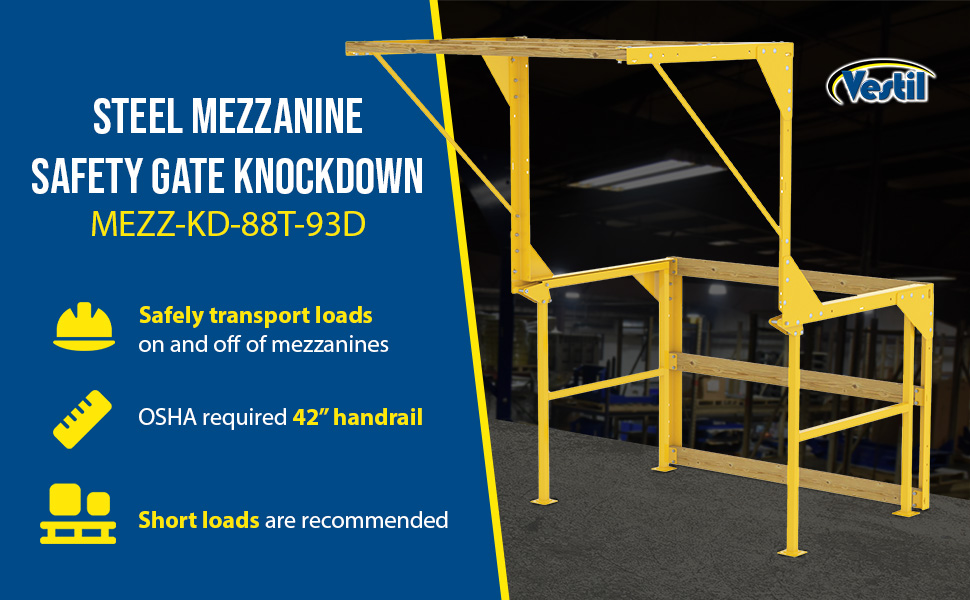 The MEZZ-KD-88T-93D ships knockdown to the customer. The 6 wooden cross rails are not included and must be supplied by the customer. Cross rails can have a maximum overall length up to 96" The MEZZ-200-BT has a bolt-together design, so the gate can be constructed, disassembled, or easily transferred to a new location. Other Mezzanine Safety Gates: Sliding Mezzanine Safety Gates | Rotating Mezzanine Gate System |