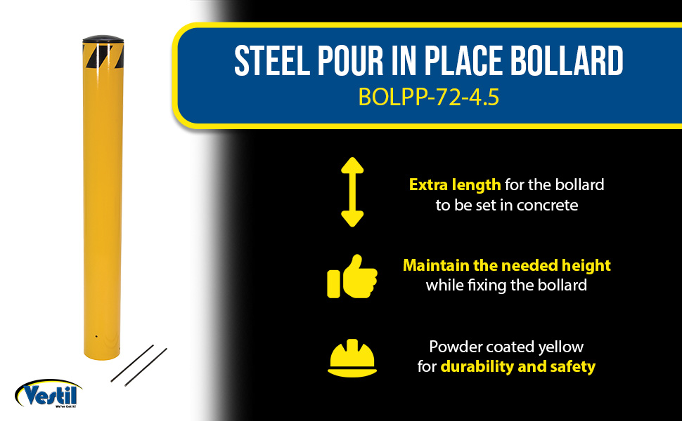 Make your bollards permanent by setting them in concrete. The extra length of the Pour in Place Bollard allows you to maintain the needed height while fixing the bollard in concrete. Bollard comes with slide through lag anchors and a removable cap so the bollard can be filled with concrete to increase its strength and durability. Baked-in powder-coated or hot dipped galvanized finish for added toughness. Assembly required.