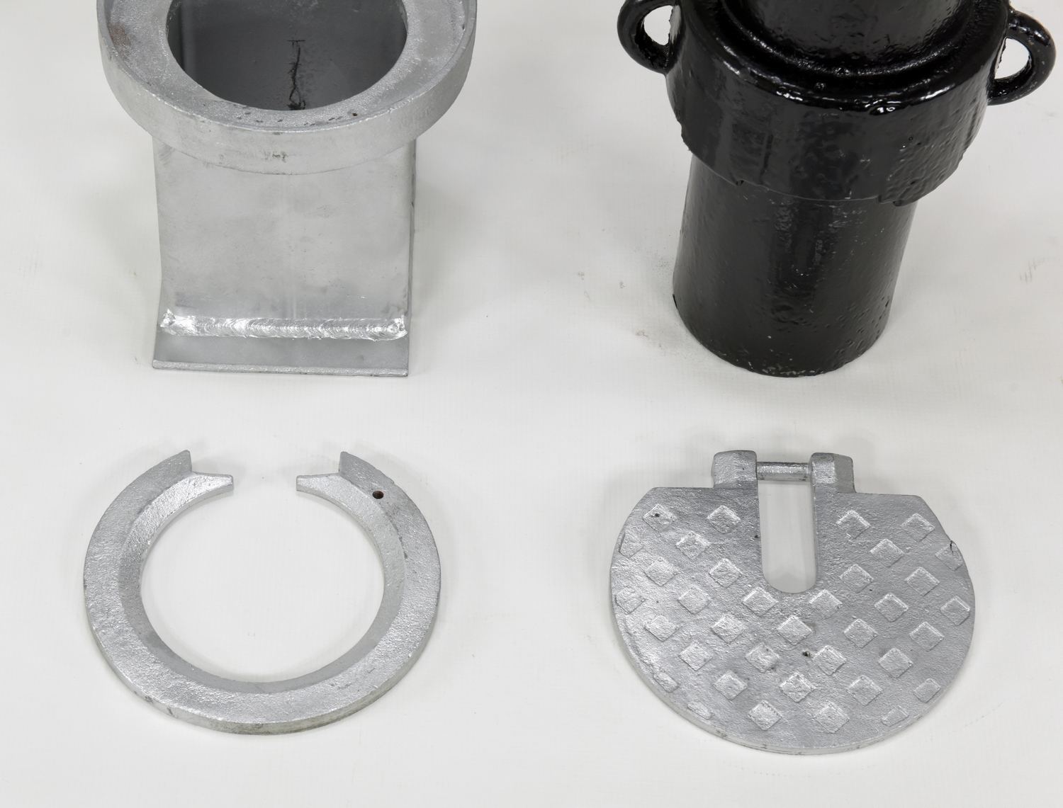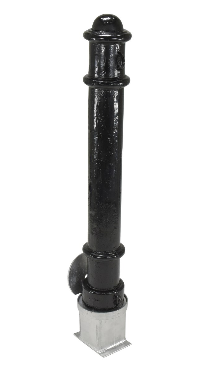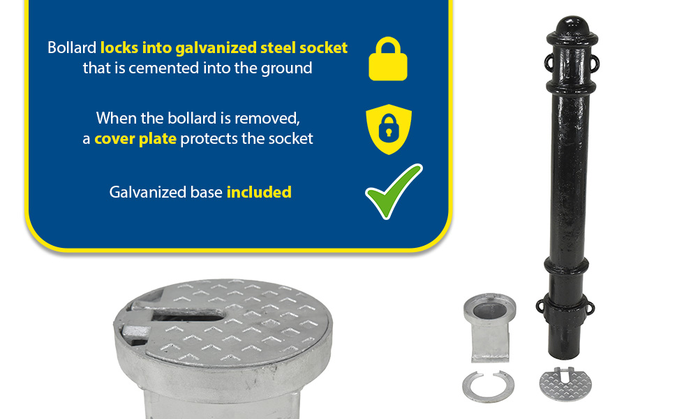 Provide an attractive yet functional barrier to vehicle access and parking. Bollards are 4-1/2" in diameter, while rings make the overall diameter 6". Padlock not included. Powder coat black finish. Includes eyes for attaching chain or rope. BOL-OR-40-BK, locks into a galvanized steel socket that is cemented into the ground. When the bollard is removed, a cover plate protects the hole leaving no protrusion above the surface. Galvanized base is included with the bollard. BOL-OR-40-BK-SM, fits into a steel socket that is bolted to ground (mounting hardware not included).