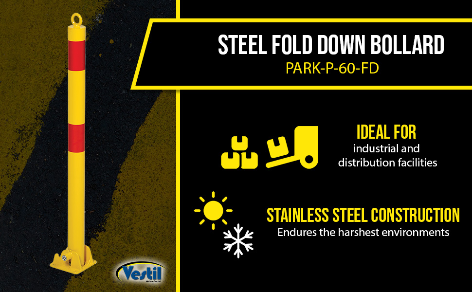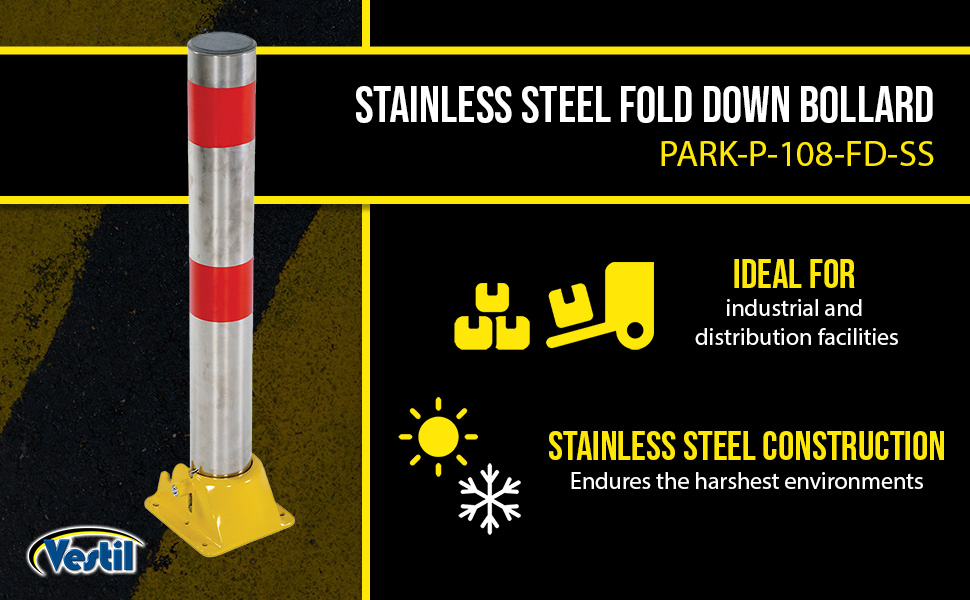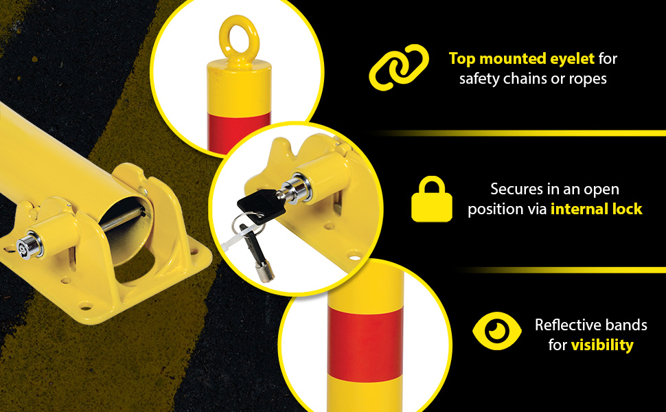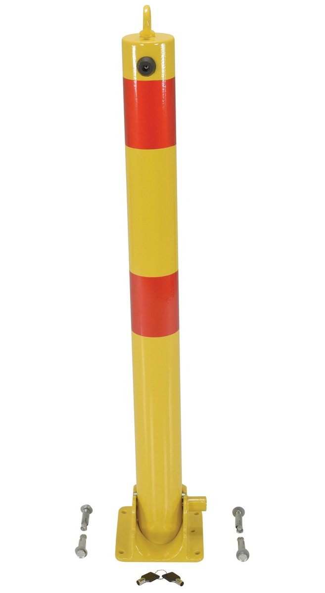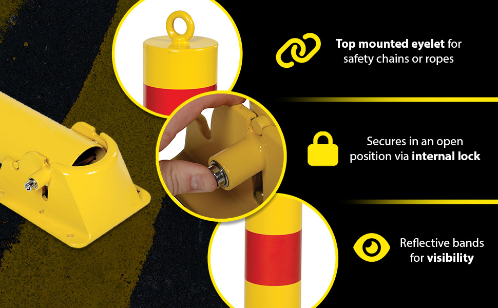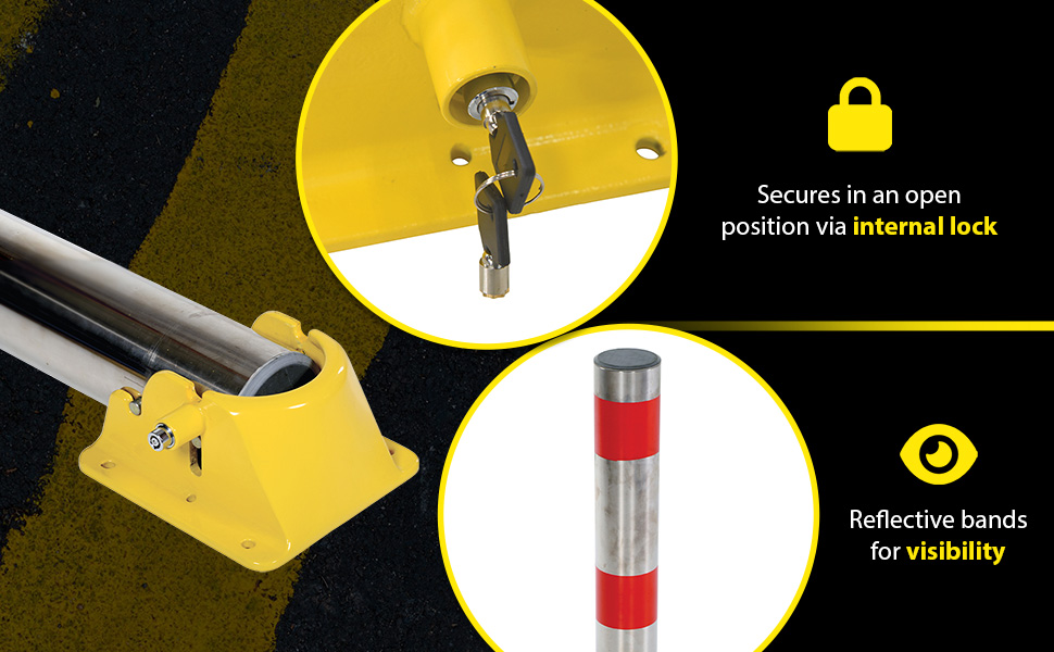 Ideal for vehicle access control. These heavy duty bollards feature integrated locking and an easy to operate cam-lock. Unit secures in open position via internal lock. Two (2) keys included. Four (4) 3/8" x 3" concrete anchors included for securing bollard to concrete. Two (2) wrap around reflectors adhere to the baked-in powder-coated toughness or stainless steel finish. The anti-tamper design and cast steel covering foot is made in a mold, therefore there are no welds. Can be used in conjunction with our Fixed Height Bollards.