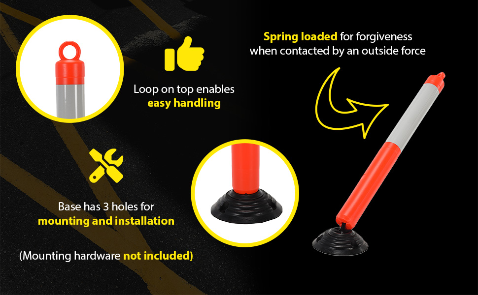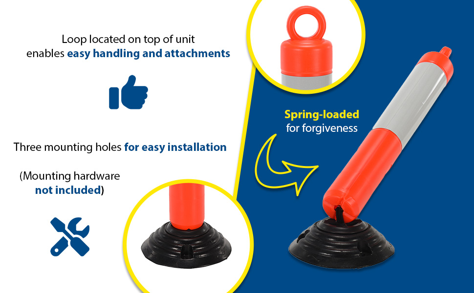 Orange Plastic Bollards are engineered for safety and the reduction of accidents. A fluorescent orange color scheme with white reflective tape promotes safety and visibility. A loop located at the top of the unit enables easy handling and is ideal for any workplace. Spring loaded for forgiveness when contact by an outside force. Base has 3 holes for mounting to surface. Hardware for mounting base is not included.