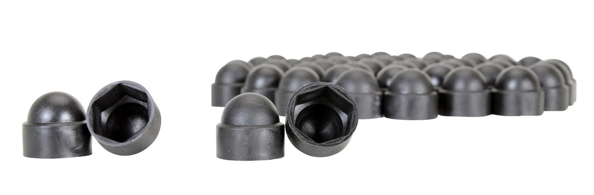 Bolt Covers are designed to finish and protect bolt heads. They have an easy press fit installation over the existing nut. Molded black plastic construction. Plastic Hardware Caps snap over the top of anchor bolts and washers to protect from weathering.