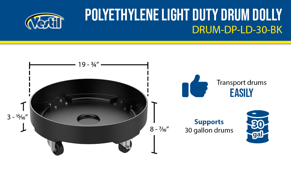 DRUM-DP-LD-30-BK DRUM-DP-LD-30-BKPolyethylene Light Duty Drum Dolly 30 Gallon 19-3/4 In. x 19-3/4 In. x 8-7/16 In. 300 Lb. Capacity BlackUniform Capacity (lb.): 300
