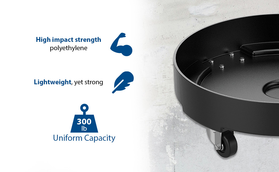 DRUM-DP-LD-55-BK DRUM-DP-LD-55-BKPolyethylene Light Duty Drum Dolly 55 Gallon 24-1/4 in. x 24-1/4 In. x 8-5/16 In. 300 Lb. Capacity BlackUniform Capacity (lb.): 300
