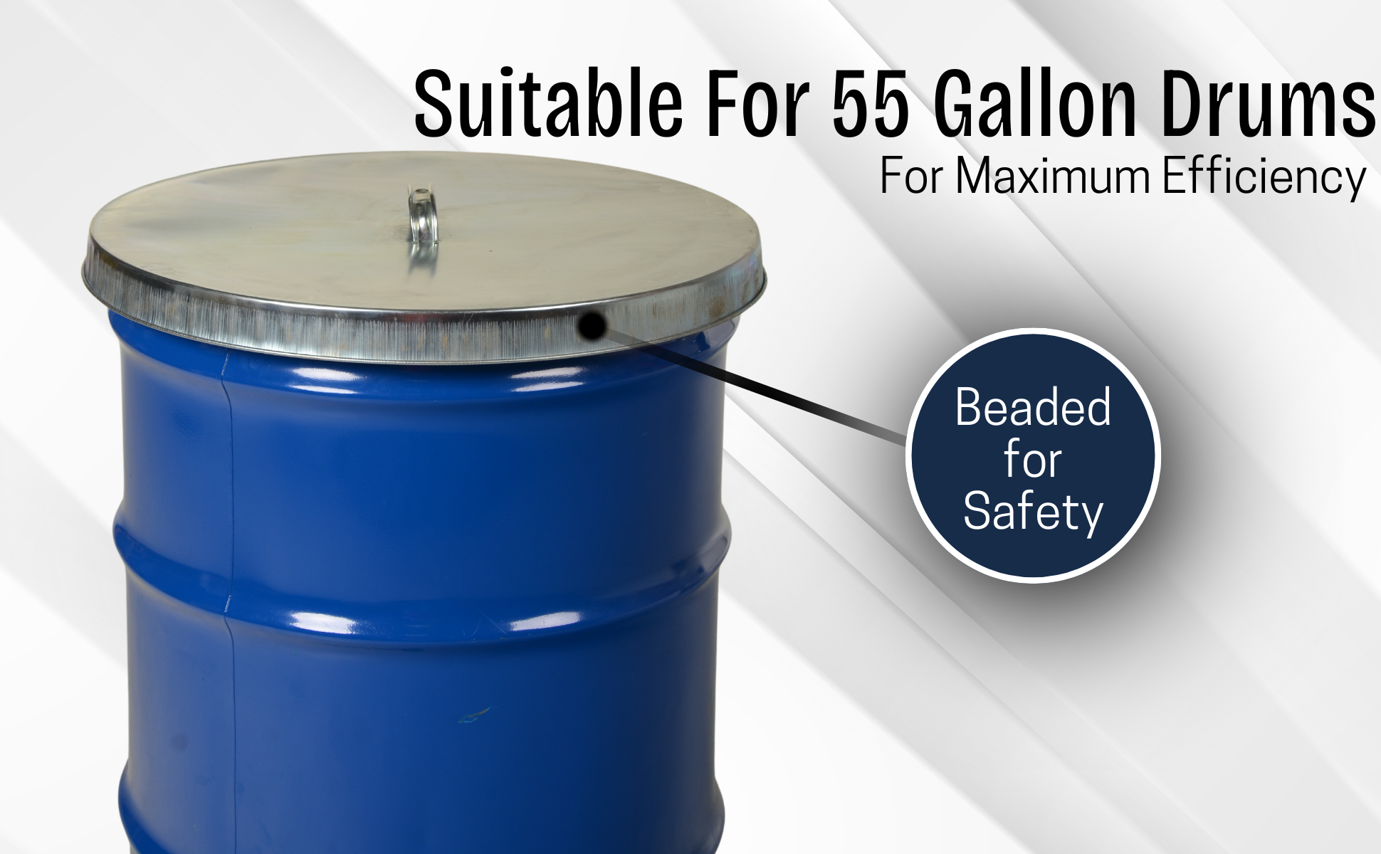 Galvanized Steel Drum Covers [Prop 65 Warning] for 55 gallon drums. Manufactured from 26 gauge galvanized steel. Cover drum tops for added protection. Perimeter rim is beaded for safety.