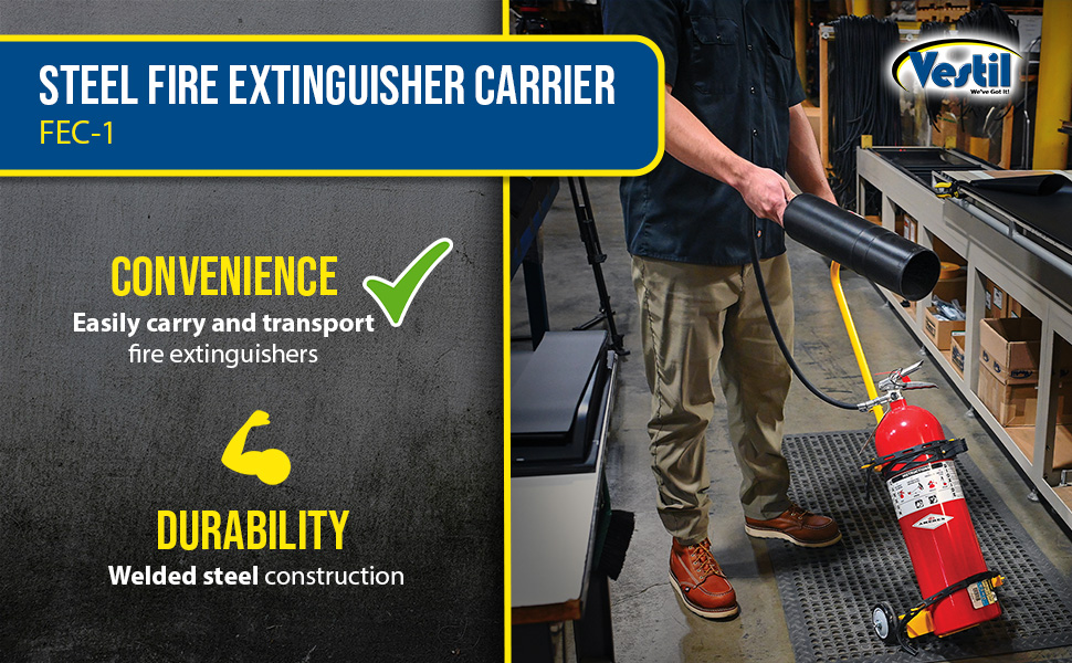 The Fire Extinguisher Carrier, model FEC-1, is designed for easily transporting your fire extinguisher up to 8" in diameter. Includes two (2) heavy duty adjustable rubber straps. Sturdy handle with rubber grip and poly casters for tilt-n-go portability. Welded steel construction with yellow baked-in powder-coat toughness. 4" x 2" stabilizing plate keeps unit upright when empty and helps retain extinguisher. Adjustable EPDM restraining straps keep extinguisher secure and allow for quick access. Wall mount bracket included to store the extinguisher off the floor.