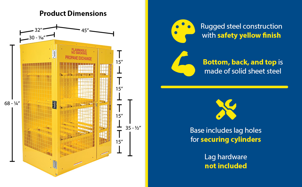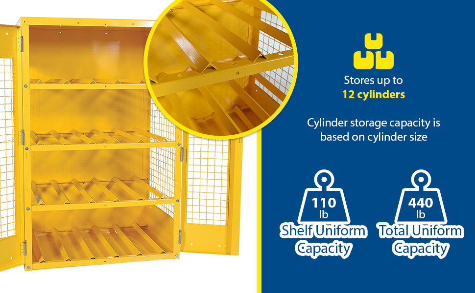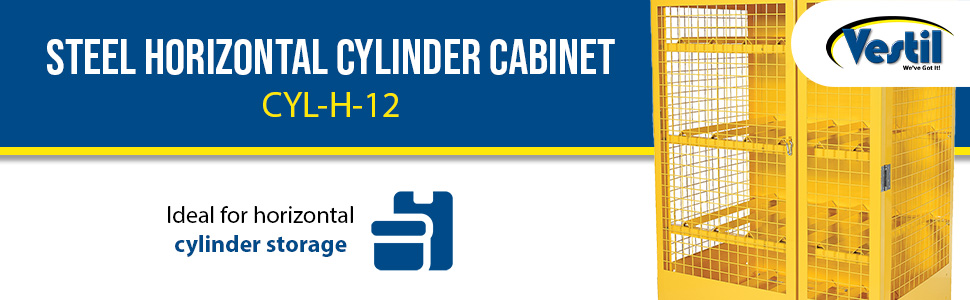Steel cabinets for storage of cylinders. Cylinder storage capacity is based on cylinder size. Sides are made of expanded steel for an open view design. The top, back, and bottom is made of solid sheet steel. Lockable doors protect cylinders (padlock not included). Base includes lag holes for securing cylinders. Vertical units include chains for securing cylinders. Includes red lettered signage noting "Flammable-No Smoking" contents. Meets OSHA 1910.110 (f)(6)(ii), ANSI NFPA 55 + 58 and CGA P-1 design standards. Rugged steel construction with a baked-in powder coated safety yellow finish for toughness. Knock down versions available, suffix -KD Check out Vestil's Other Storage Cabinets: