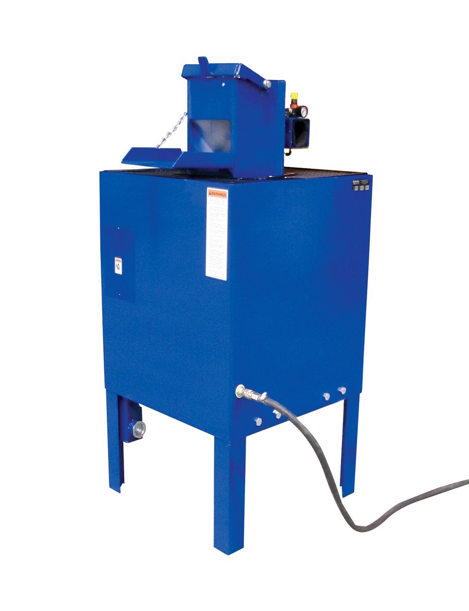 The Aerosol Can Crusher uses air bag technology and is 100% air operated with 15 tons of crushing force, enough to shatter the mixing ball. Crushes 2 aerosol cans by 98%. Equipped with a timer and filter regulator gauge, the crusher has a cycle time of 25-60 seconds and requires air input of 120 psi. An outlet valve allows for draining and capturing liquid. Activated carbon filter absorbs contaminants and odors and a fume extractor directs gases outside of area. Greatly reduces disposal costs.