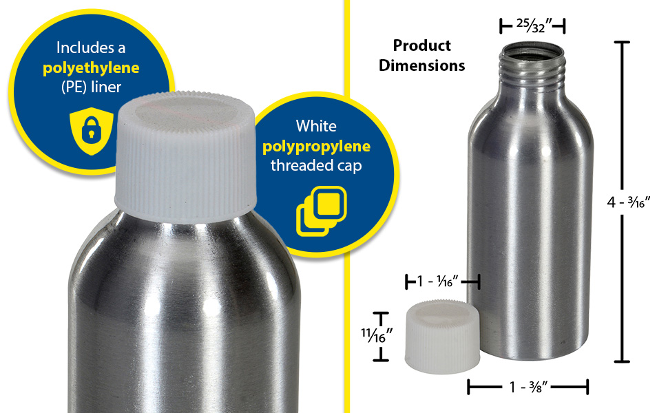 Aluminum bottles are lightweight and very rigid. Includes polypropylene (PP) threaded cap with polyethylene (PE) foam liner.