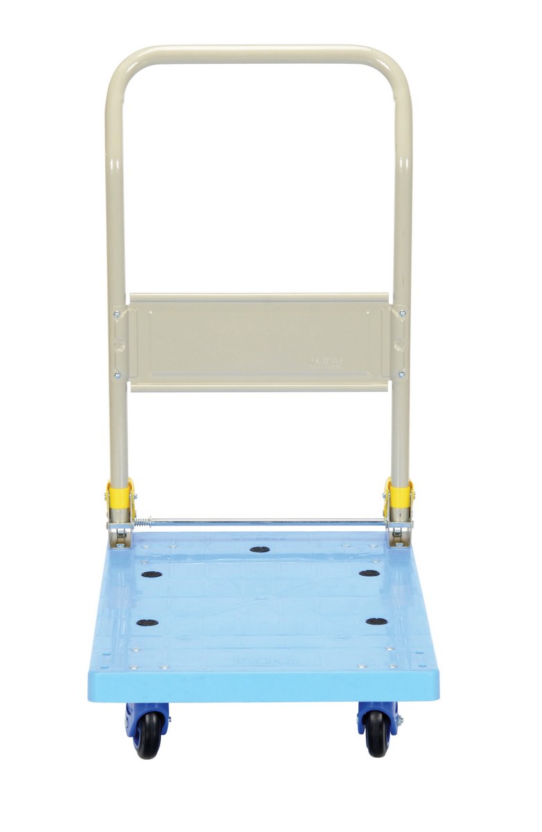 Light weight plastic platform trucks handle large loads, ideal for shops, schools, hospitals, supermarkets, warehouses and offices. Low start resistance to move the loads. 25-30% less force vs. conventional casters. Designed to move loads with less effort. High quality double bail bearings. Injection molded plastic platform with foldable handle for easy storage when not in use. Anti-skidding surface. Extra strong and durable platform. Foldable handle can be attached to opposite side to pull the cart. Handle double-finish painted. Safety protection covers on handle hinges.