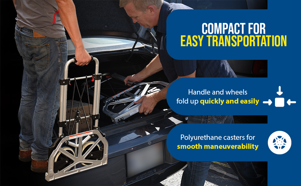 The Aluminum Fold-Up Hand Truck is designed for everyday, all purpose use. The handle and wheels fold up quickly and easily allowing you to store it in tight spaces such as trunks of cars, under tables, or in closets.