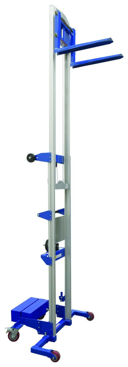 Aluminum/Steel Manual Hand Winch Lift Truck With Counter Balance 350 Lb. Capacity Silver/BlueThe hand winch lift truck is compact and designed to lift material to and from shelves, move office equipment, and install ceiling/wall appliances. It's constructed of durable steel-and-aluminum and a counterbalance design (counterweight included). Operated by a hand-crank winch that features a reversible handle and hold-down device for securing the carriage during transport. The non-adjustable forks can be inverted to provide different height ranges.