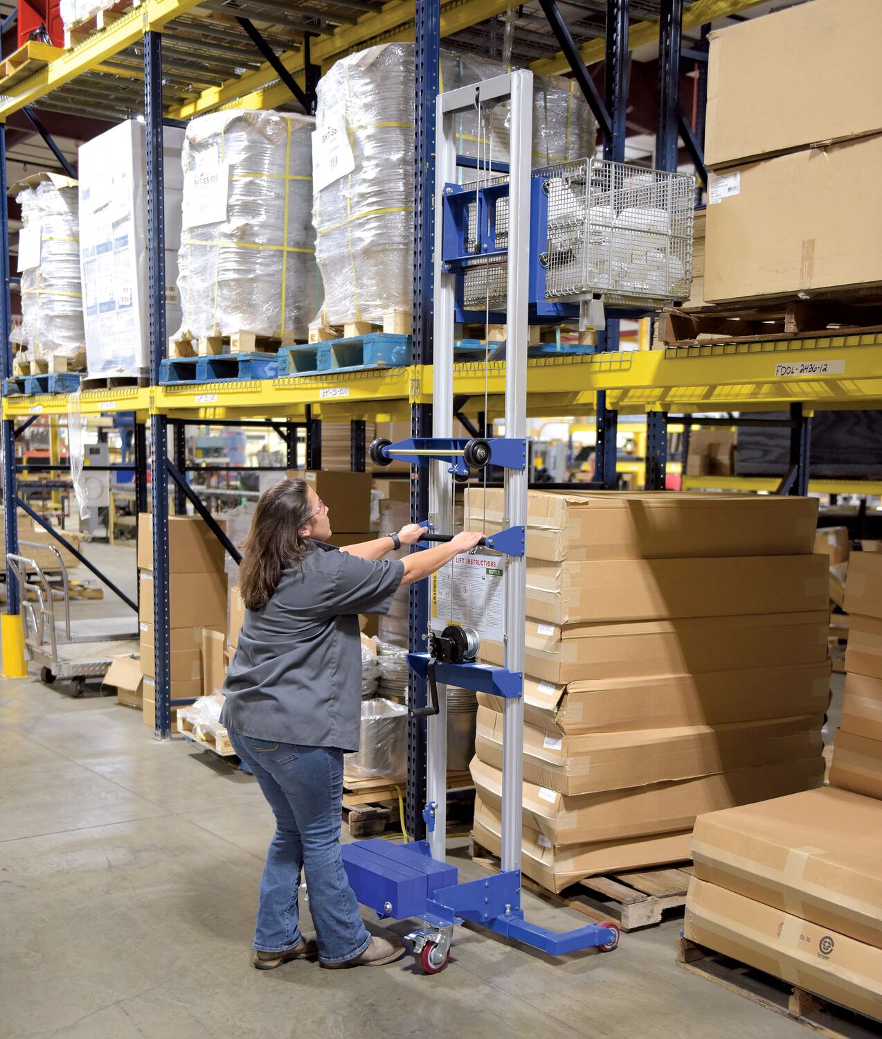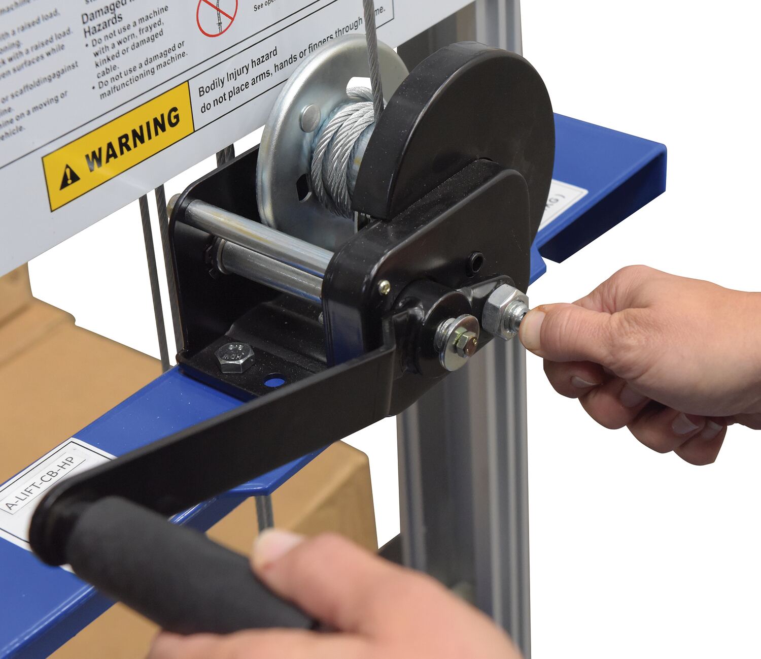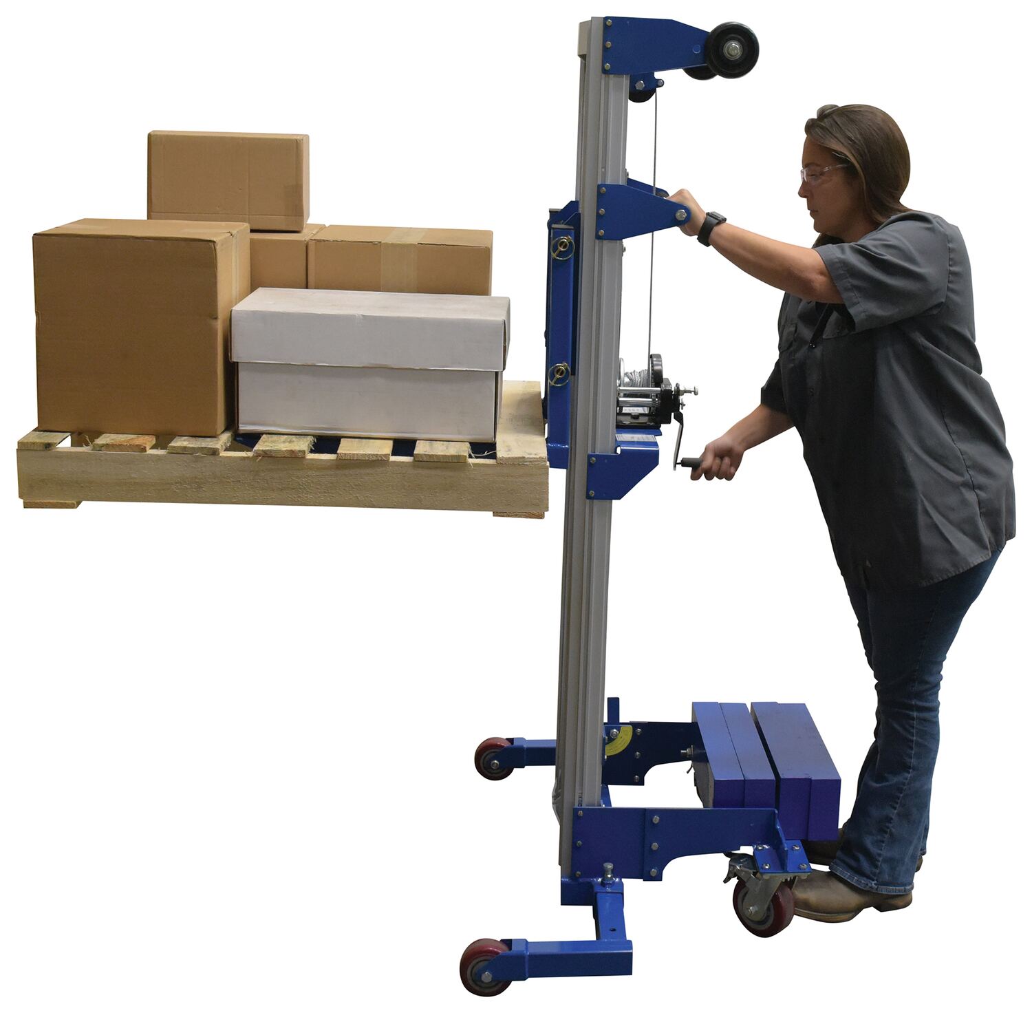 Aluminum/Steel Manual Hand Winch Lift Truck With Counter Balance 400 Lb. Capacity Silver/BlueThe hand winch lift truck is compact and designed to lift material to and from shelves, move office equipment, and install ceiling/wall appliances. It's constructed of durable steel-and-aluminum and a counterbalance design (counterweight included). Operated by a hand-crank winch that features a reversible handle and hold-down device for securing the carriage during transport. The non-adjustable forks can be inverted to provide different height ranges.