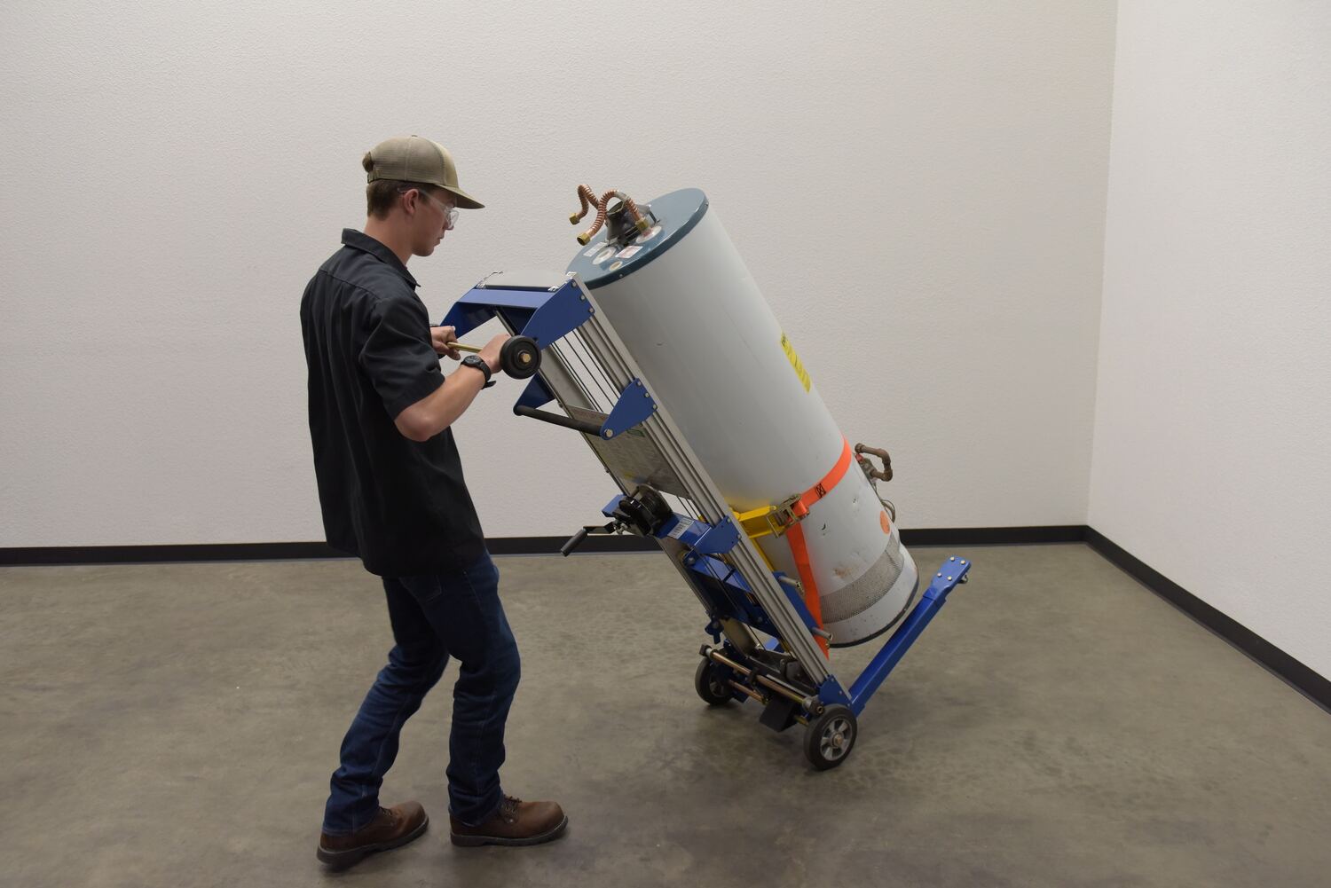Steel Manual Winch Heater Tank Lift Truck 300 Lb. Capacity Blue/Silver/YellowWhen a heater tank needs to be lifted look no further than the heater tank lift truck. The lift is compact and designed to lift tanks in a variety of sizes. It's constructed of durable steel with a powder coated finish for long lasting durability. Lifting operation is utilized by a hand-crank winch for perfect placement.