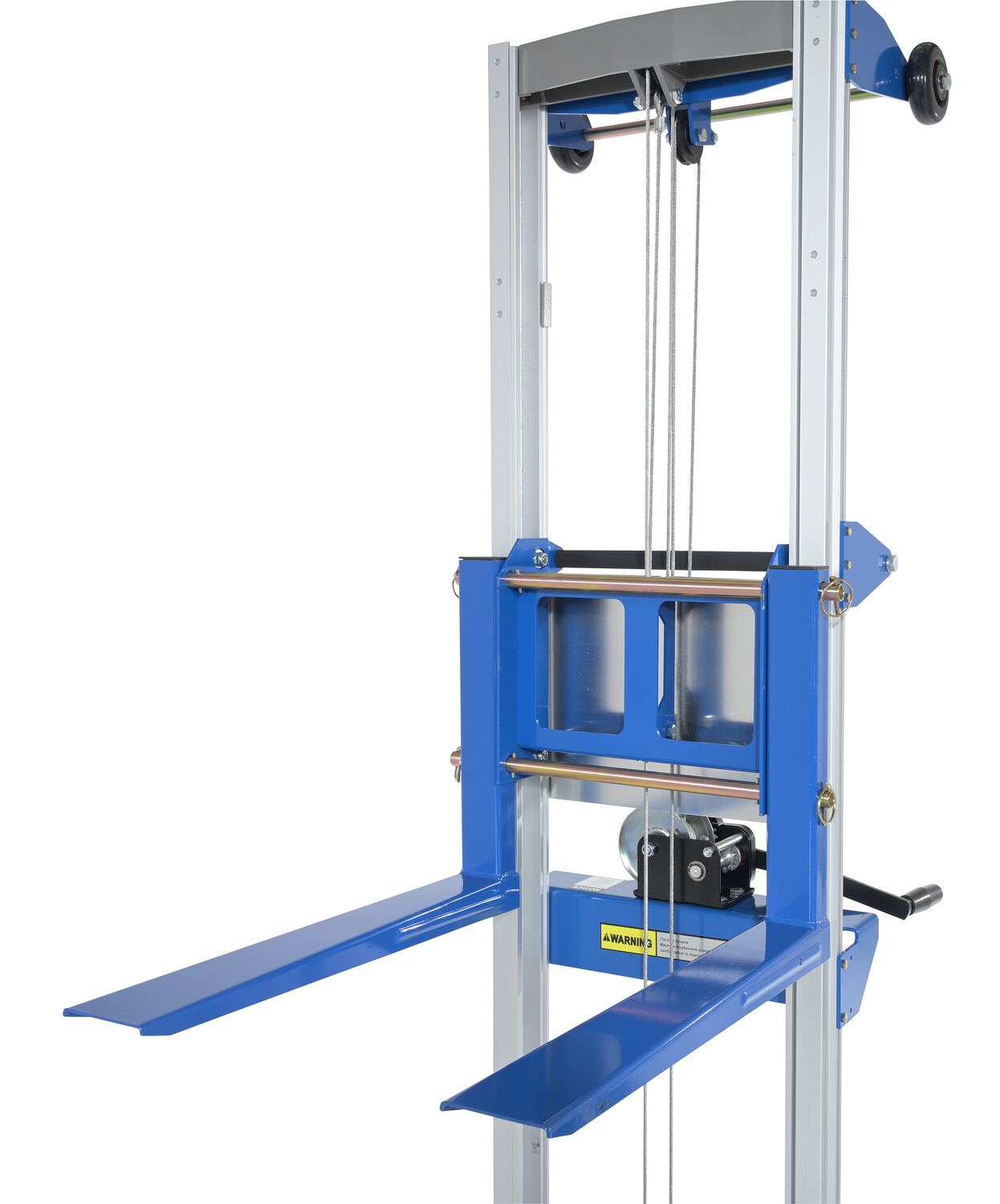 Aluminum/Steel Adjustable Straddle Manual Hand Winch Lift Trucks 350 Lb. Capacity Silver/BlueThe hand winch lift truck is compact and designed to lift material to and from shelves, move office equipment, and install ceiling/wall appliances. It's constructed of durable steel-and-aluminum. Operated by a hand-crank winch that features a reversible handle and hold-down device for securing the carriage during transport.